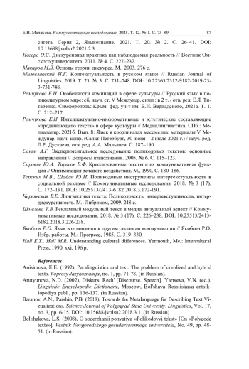 16. Шмелева Т.В. Рекламный модульный текст в медиа: визуальный аспект // Коммуникативные исследования. 2018. № 3 (17). С. 226-238. DOI: 10.25513/2413-6182.2018.3.226-238 EDN: YHIKRV