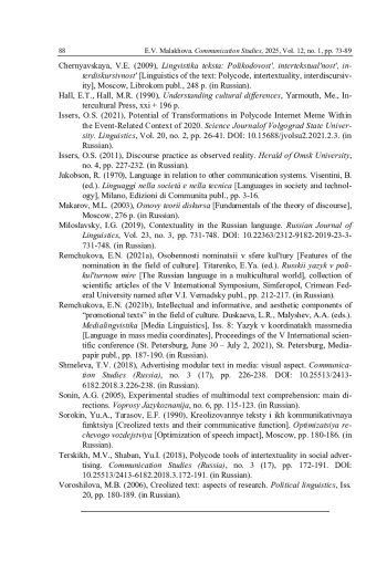 13. Сорокин Ю.А., Тарасов Е.Ф. Креолизованные тексты и их коммуникативная функция // Оптимизация речевого воздействия. М., 1990. С. 180-186. EDN: UWKFKR