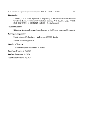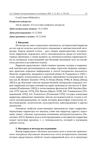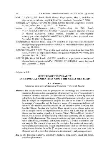 Статья, выполненная в русле нарратологии и коммуникативной лингвистики, посвящена рассмотрению темпоральности как одного из конститутивных признаков исторического нарратива. Актуальность исследования обусловлена необходимостью освещения языковых параметров исторического нарратива, что до сих пор не являлось объектом комплексного анализа. Цель исследования заключается в рассмотрении понятия темпоральности и средств его языкового выражения применительно к историческому нарративу. В качестве исследовательского материала использованы 113 нарративов о Великом шелковом пути на китайском, русском и английском языках. Их выбор в качестве объекта анализа обусловлен тем, что Великий шелковый путь занимает значительное место в истории человечества, а апелляция к нему через китайский проект «Один пояс - один путь» способствует пониманию исторической преемственности и динамики данного явления. Приоритетные методы исследования - нарративный, дефиниционный, контекстуальный и стилистический анализ, а также элементы контент-анализа. В ходе исследования показано, что в качестве маркеров темпоральности могут выступать грамматические и лексические языковые средства (временные формы глагола в английском и русском языках, суффикс 了(le), временные наречия, контекст и порядок слов в китайском языке и т. д.), а также прецедентные феномены, интертекстуальность и пресуппозиции