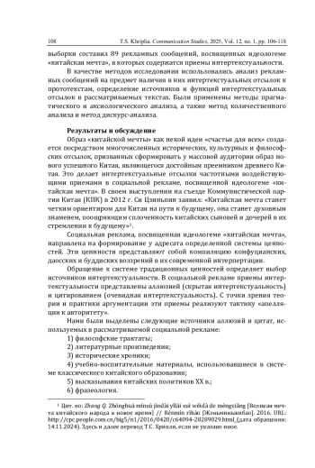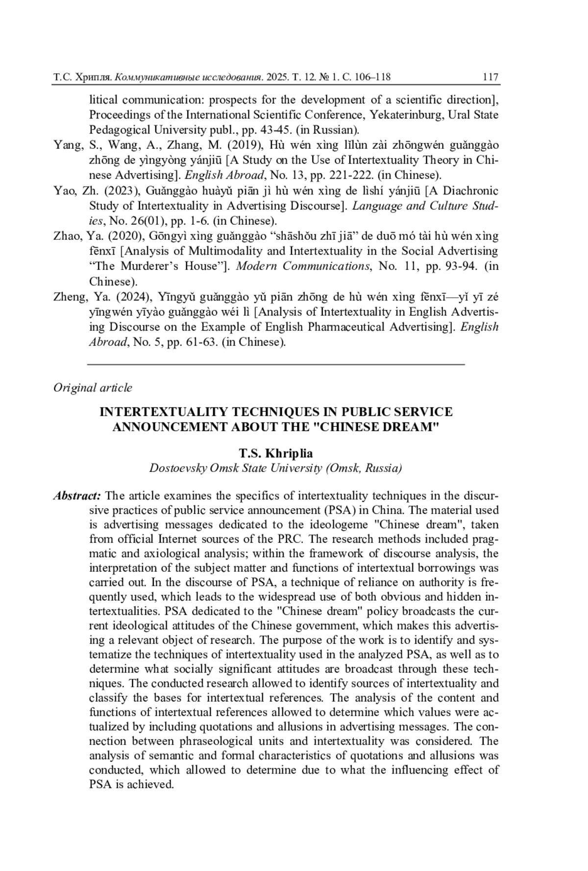 12. Хрипля Т.С., Иссерс О.С. Общенациональная идея “китайской мечты” в поликодовых текстах социальной рекламы КНР // Журнал Сибирского федерального университета. Серия: Гуманитарные науки. 2023. Т. 16. № 6. С. 973-990. EDN: ZIOXST