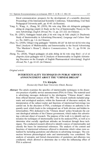 В статье рассматривается специфика приемов интертекстуальности в дискурсивных практиках социальной рекламы КНР. В качестве материала используются рекламные сообщения, посвященные идеологеме «китайская мечта», взятые из официальных интернет-источников КНР. Методы исследования включали в себя прагматический и аксиологический анализ, в рамках дискурс-анализа осуществлялась интерпретация тематики и функций интертекстуальных заимствований. В дискурсе социальной рекламы часто прибегают к такому приему, как опора на авторитет, что ведет к широкому использованию как очевидной, так и скрытой интертекстуальности. Социальная реклама, посвященная политике «китайской мечты», транслирует действующие идеологические установки правительства КНР, что делает эту рекламу актуальным объектом исследования. Цель работы заключается в выявлении и систематизации приемов интерекстуальности, используемых в анализируемой социальной рекламе, а также определение того, какие социально значимые установки транслируются через эти приемы. Проведенное исследование позволило выявить источники интертекстуальности и классифицировать основания для интертекстуальных отсылок. Анализ содержания и функций интертекстуальных отсылок позволил определить, какие ценности были актуализированы за счет включения цитат и аллюзий в рекламные сообщения. Рассмотрена связь фразеологических единиц и интертекстуальности. Проведен анализ смысловых и формальных характеристик цитат и аллюзий, что позволило определить, за счет чего достигается воздействующий эффект социальной рекламы