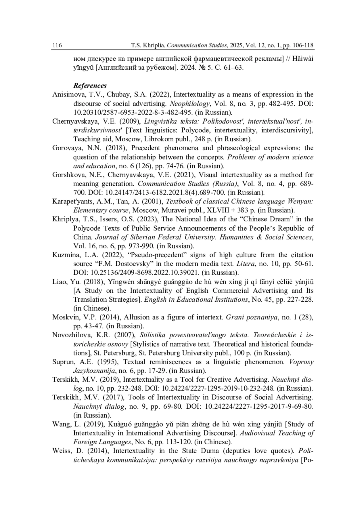 17. Yao Zh. Guǎnggào huàyǔ piān jì hù wén xìng de lìshí yánjiū [Диахроническое исследование интертекстуальности в рекламном дискурсе] // Yǔyán yǔ wénhuà yánjiū [Исследования языка и культуры]. 2023. № 26 (01). С. 1-6.