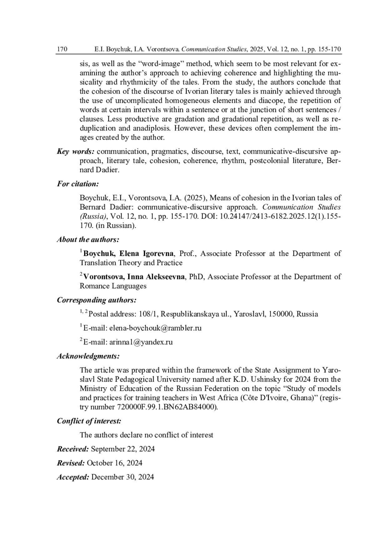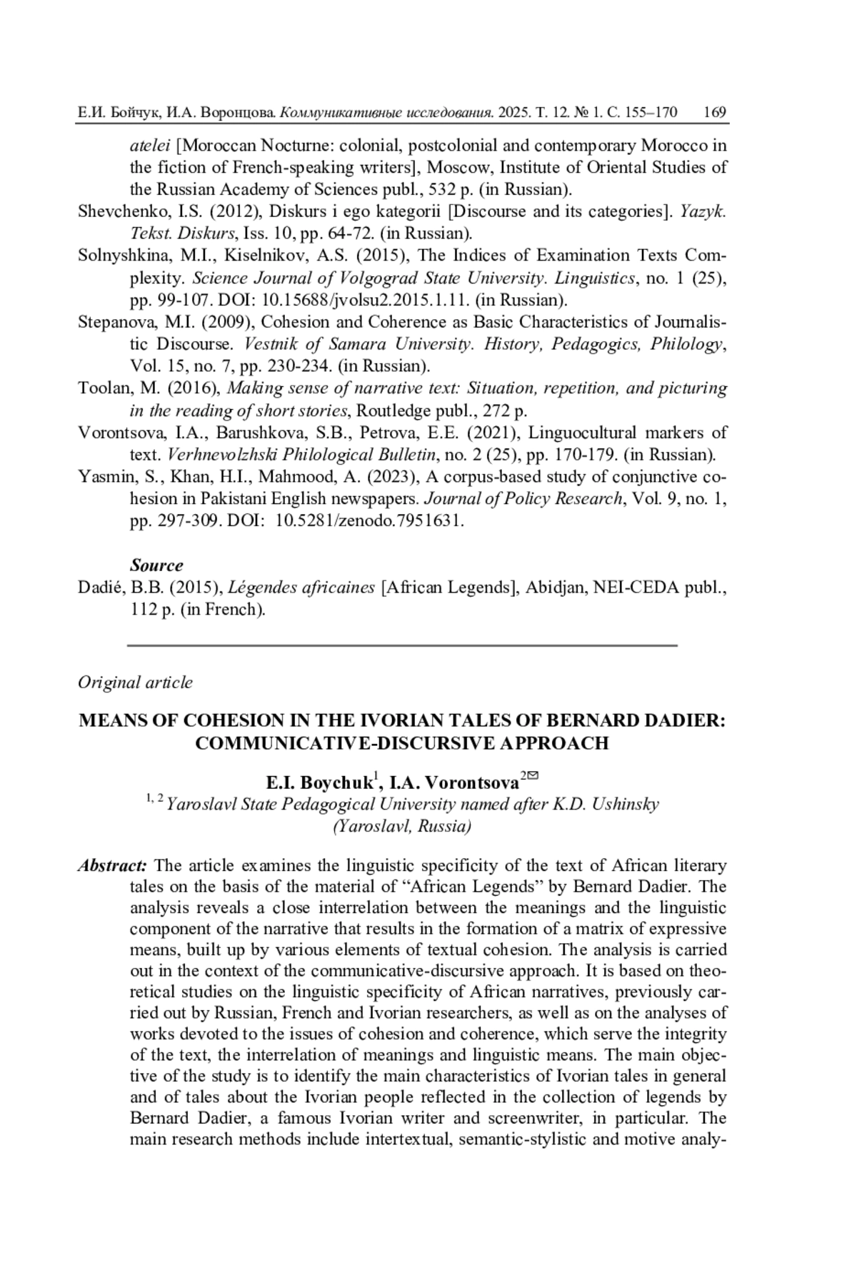 В статье представлена языковая специфика текста африканских сказок на материале сборника «Африканские легенды» Бернара Дадье, тесная взаимосвязь смыслов и лингвистической составляющей повествования, матрица средств выразительности, которая представлена посредством различных элементов когезии текста. Данный анализ осуществлен в русле коммуникативно-дискурсивного подхода. Теоретическую основу исследования составили работы российских, французских, ивуарийских ученых, посвященные языковой специфике африканских сказок, а также исследования вопросов когезии и когерентности, служащих целостности текста и дискурса, взаимосвязи смыслов и языковых средств. Основной целью исследования является установление характерных особенностей ивуарийских сказок вообще и определение специфики историй об ивуарийском народе, отраженных в сборнике легенд Бернара Дадье, известного ивуарийского писателя и сценариста. Основными методами исследования из частнофилологических являются интертекстуальный анализ, семантико-стилистический метод, метод «слово-образ», мотивный анализ, которые позволили выявить авторские способы достижения когерентности текста сказок, подчеркнуть их музыкальность и ритмичность. В качестве основного результата исследования можно отметить то, что когезия ивуарийского авторского сказового дискурса как смысловое и языковое единство выражается в большей степени при помощи двух средств, а именно употребления неосложненных однородных членов и диакопы, повтора слов через определенные промежутки внутри одного предложения или на стыке коротких предложений. Менее активны градация и градационный повтор, а также редупликация и анадиплозис, однако данные средства часто дополняют создаваемые автором образы