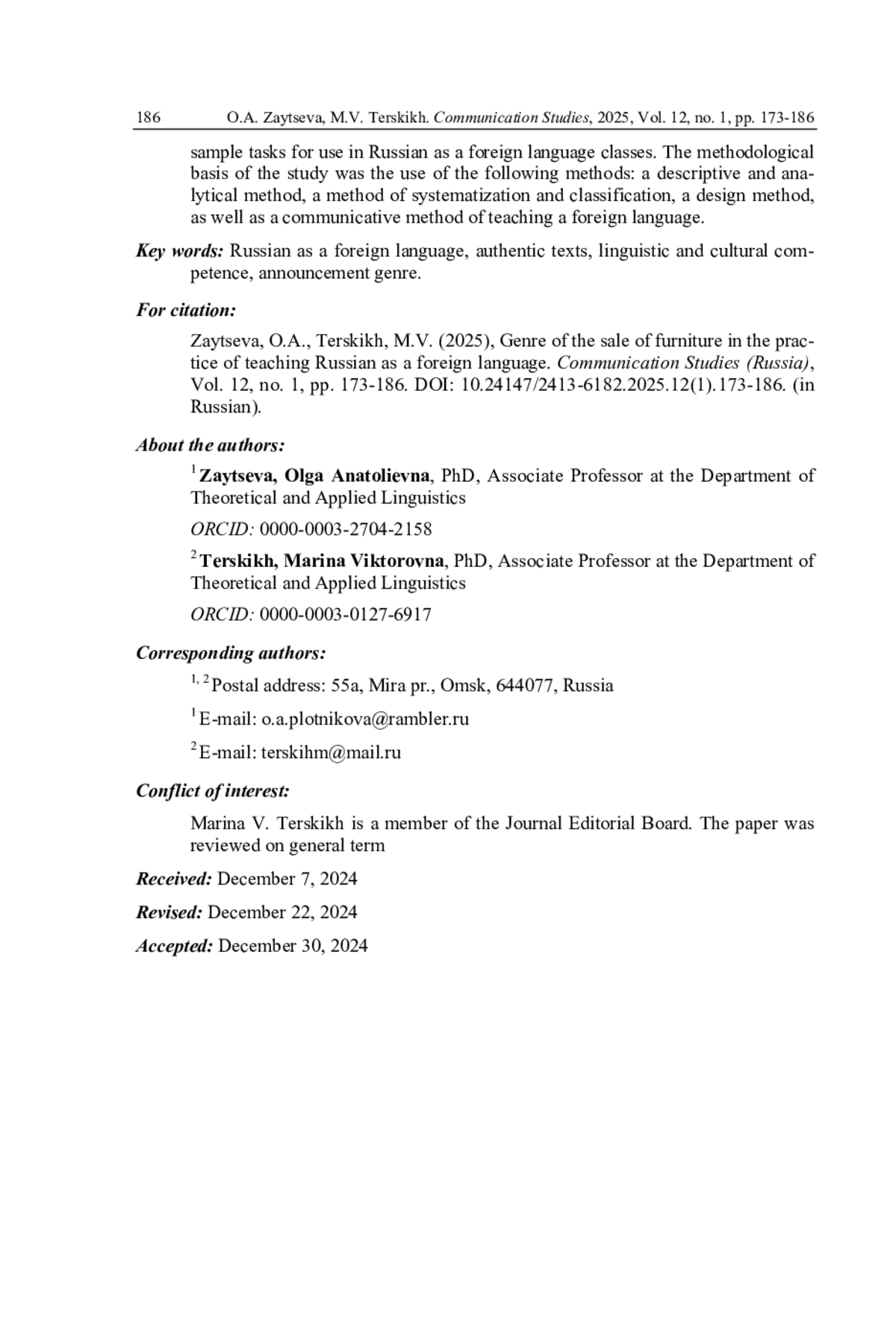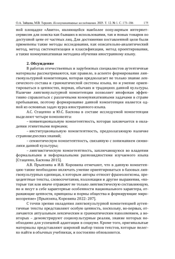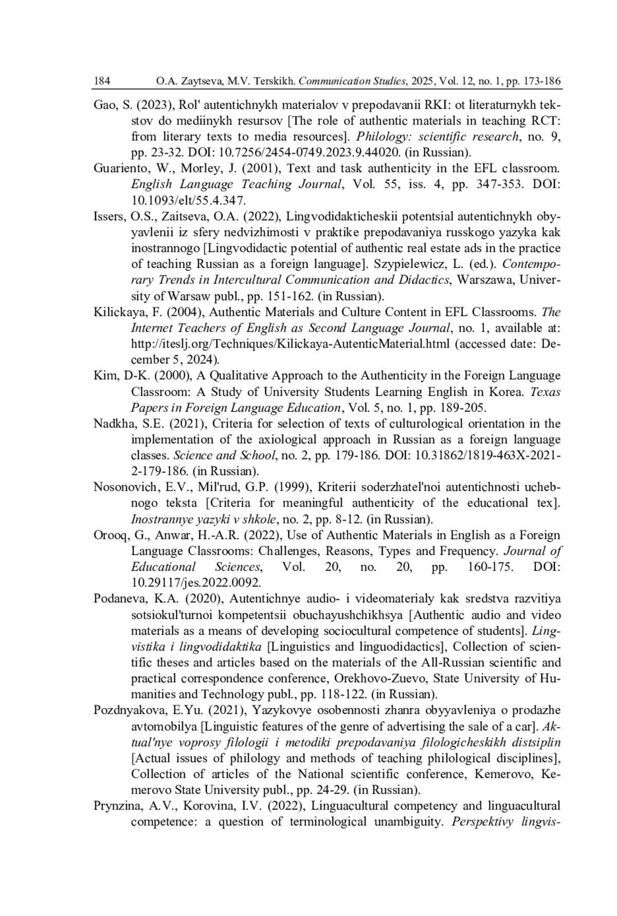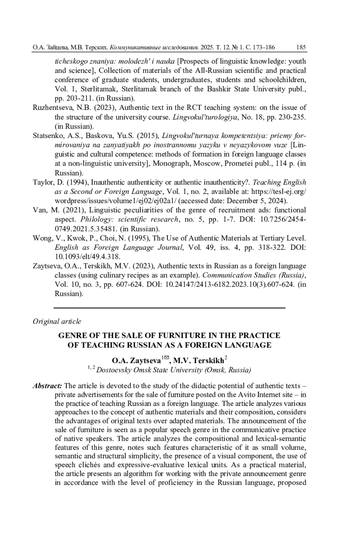 5. Зайцева О.А., Терских М.В. Использование аутентичных текстов на занятиях по русскому языку как иностранному (на примере кулинарных рецептов) // Коммуникативные исследования. 2023. Т. 10. № 3. С. 607-624. DOI: 10.24147/2413-6182.2023.10(3).607-624 EDN: NDLNIE