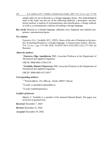 Статья посвящена изучению дидактического потенциала аутентичных текстов - частных объявлений о продаже мебели, размещенных на интернет-площадке «Авито», - в практике обучения русскому языку как иностранному (РКИ). В статье анализируются различные подходы к понятию аутентичных материалов и их составу, рассматриваются преимущества оригинальных текстов перед адаптированными материалами. Объявление о продаже мебели рассматривается как популярный в коммуникативной практике носителей языка речевой жанр. В статье анализируются композиционные и лексико-семантические особенности данного жанра, отмечаются такие характерные для него черты, как небольшой объем, семантическая и структурная простота, наличие визуального компонента, использование речевых клише и экспрессивно-оценочных лексических единиц. В качестве практического материала в статье представлен алгоритм работы с жанром частного объявления в соответствии с уровнем владения русским языком, предложены образцы заданий для использования на занятиях по РКИ. Методологическую базу исследования составили описательно-аналитический метод, метод систематизации и классификации, метод проектирования, а также коммуникативная методика обучения иностранному языку