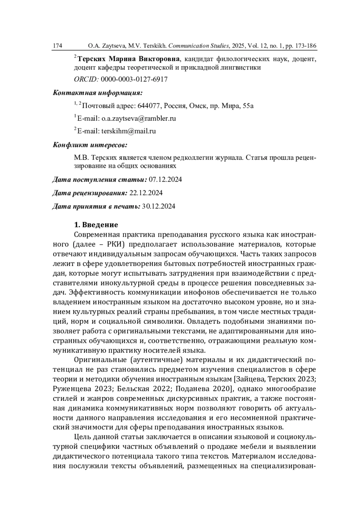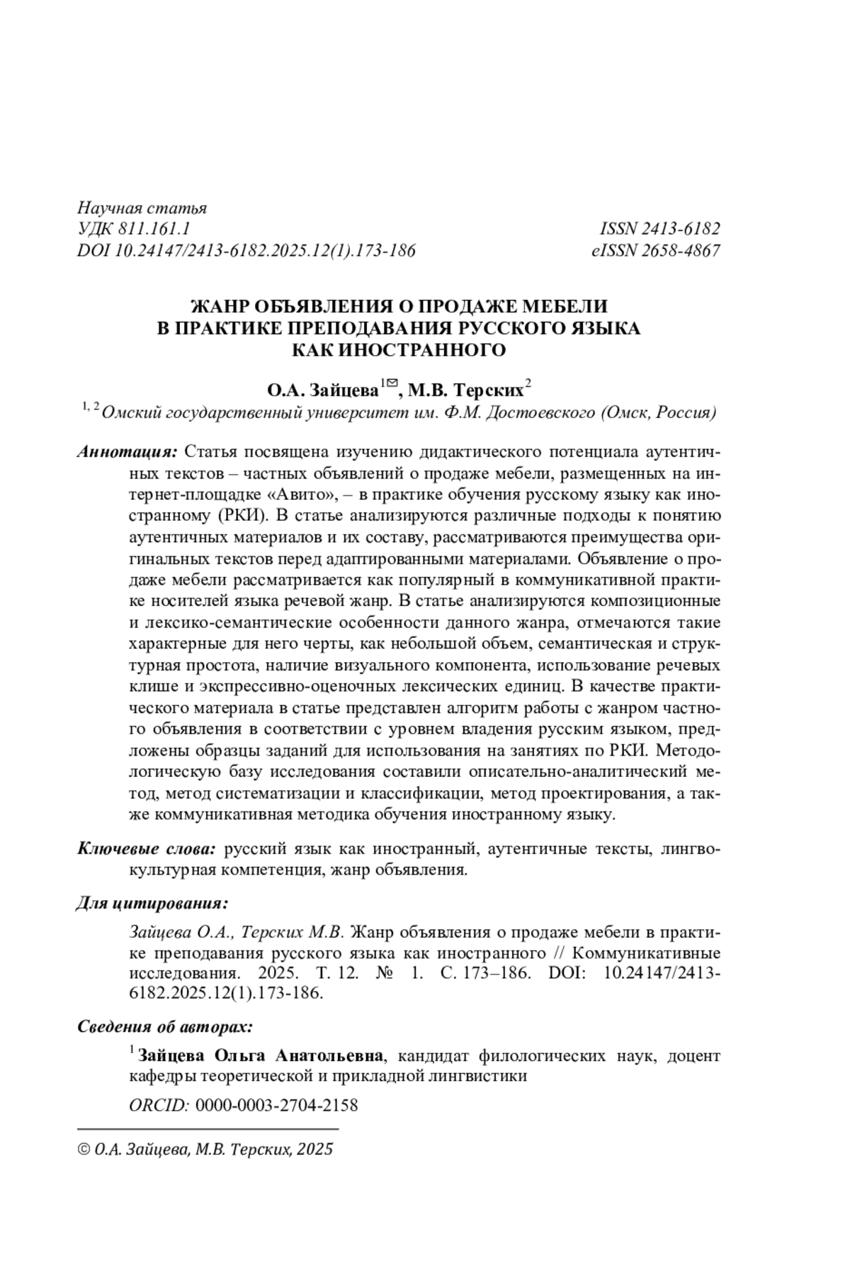 6. Иссерс О.С., Зайцева О.А. Лингводидактический потенциал аутентичных объявлений из сферы недвижимости в практике преподавания русского языка как иностранного // Современные тренды в межкультурной коммуникации и дидактике / науч. ред. Л. Шипелевич. Warszawa: Wydawnictwa Uniwersytetu Warszawskiego, 2022. С. 151-162.