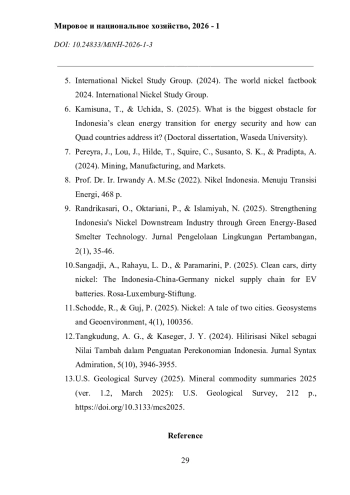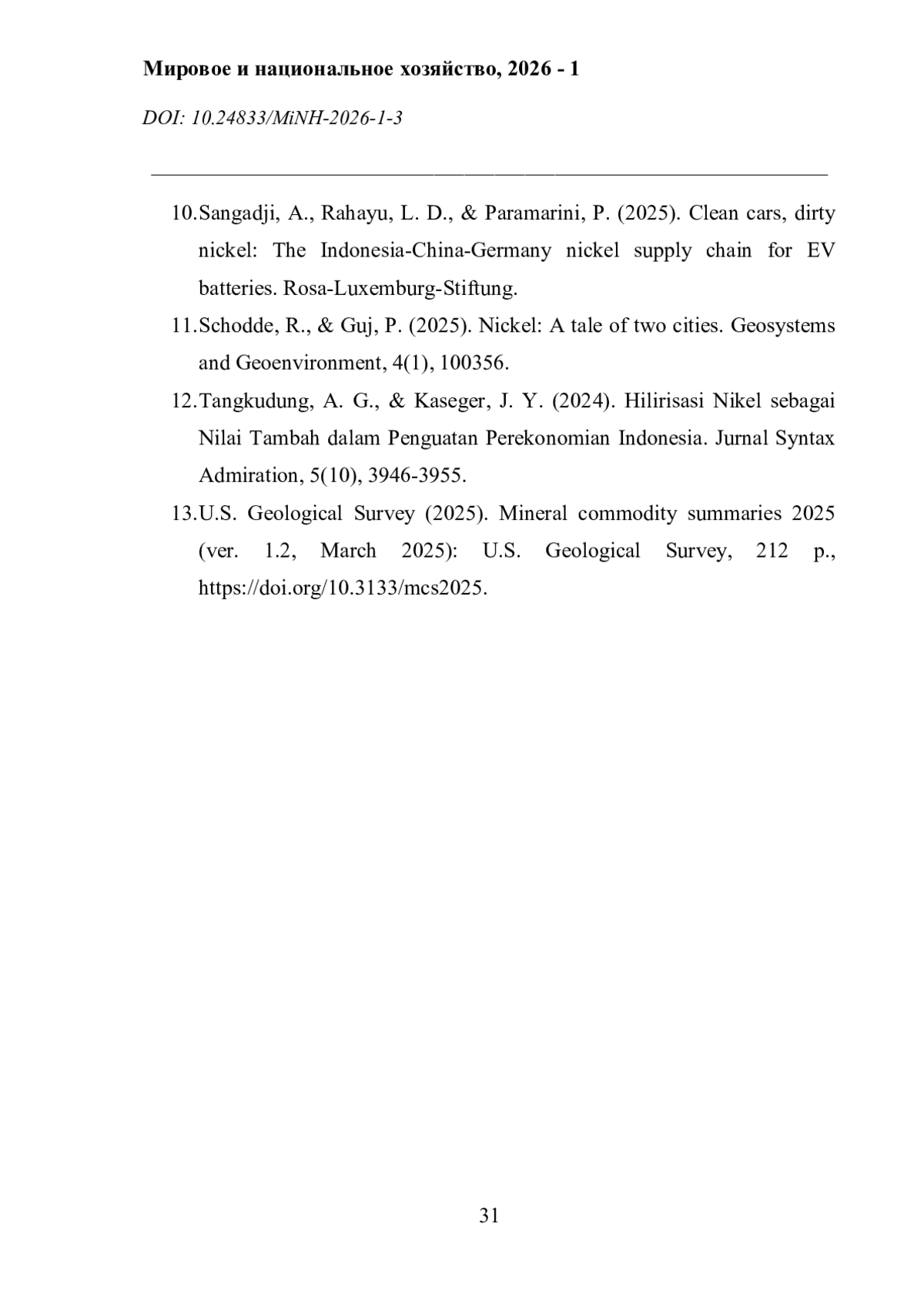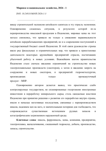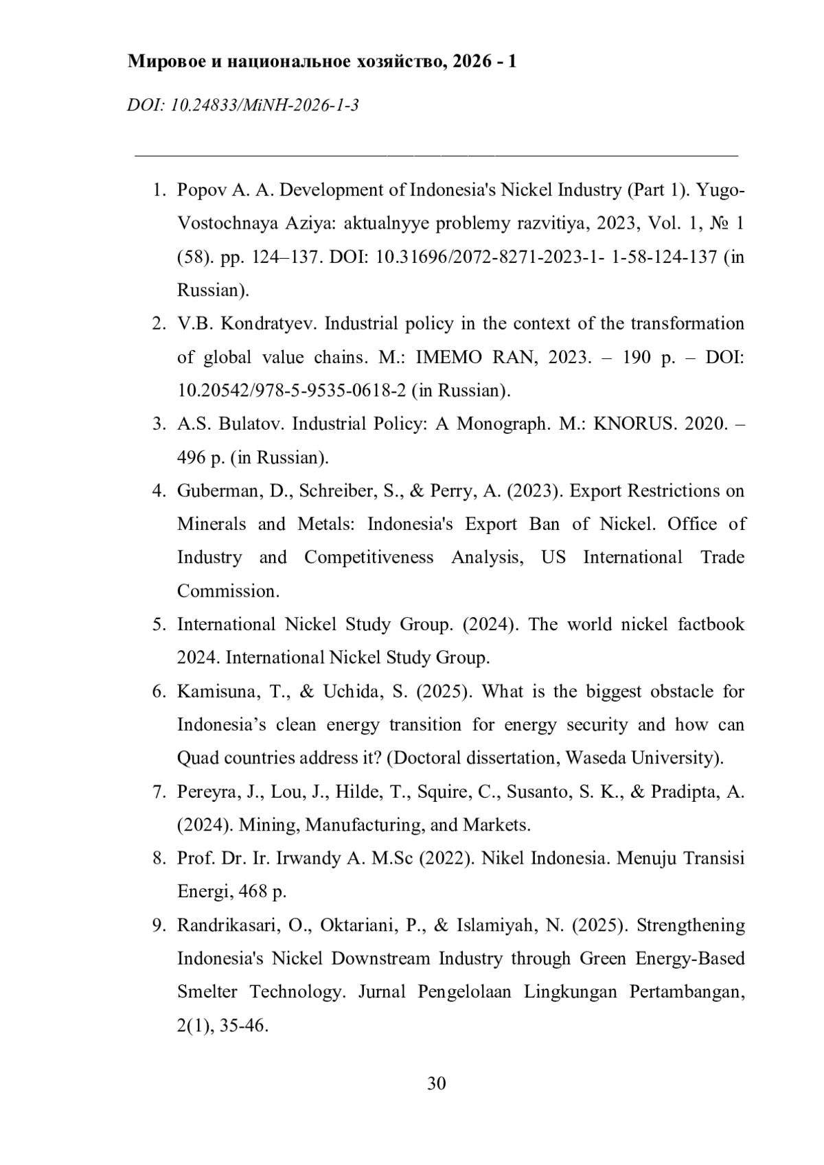 Одновременно автором делается вывод, что практически слабо контролируемые государством, не спланированные госорганами иностранные инвестиции в переработку минерального сырья, столь ожидаемые властями Индонезии при принятии решения о развитии его переработки внутри страны, имели и немалые негативные последствия, связанные с перепроизводством никеля, падением цен на него, и значительными потерями для госбюджета, что сопровождается существенным истощением рудных запасов и катастрофическим загрязнением окружающей среды.