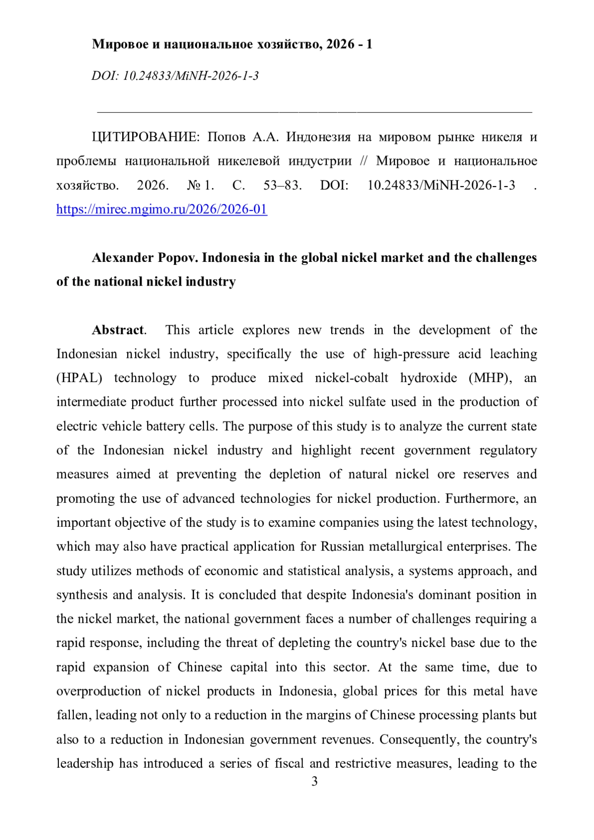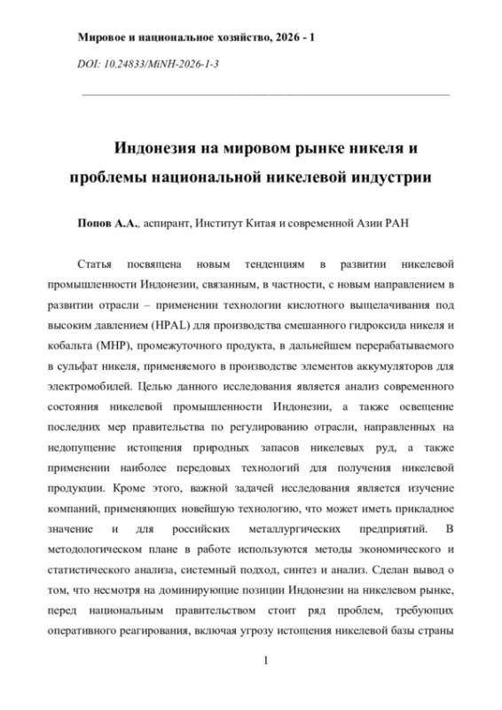 Статья посвящена новым тенденциям в развитии никелевой промышленности Индонезии, связанным, в частности, с новым направлением в развитии отрасли - применении технологии кислотного выщелачивания под высоким давлением (HPAL) для производства смешанного гидроксида никеля и кобальта (MHP), промежуточного продукта, в дальнейшем перерабатываемого в сульфат никеля, применяемого в производстве элементов аккумуляторов для электромобилей. Целью данного исследования является анализ современного состояния никелевой промышленности Индонезии, а также освещение последних мер правительства по регулированию отрасли, направленных на недопущение истощения природных запасов никелевых руд, а также применении наиболее передовых технологий для получения никелевой продукции. Кроме этого, важной задачей исследования является изучение компаний, применяющих новейшую технологию, что может иметь прикладное значение и для российских металлургических предприятий. В методологическом плане в работе используются методы экономического и статистического анализа, системный подход, синтез и анализ. Сделан вывод о том, что несмотря на доминирующие позиции Индонезии на никелевом рынке, перед национальным правительством стоит ряд проблем, требующих оперативного реагирования, включая угрозу истощения никелевой базы страны ввиду стремительной экспансии китайского капитала в эту отрасль экономики. Одновременно сложилась ситуация, в результате которой из-за перепроизводства никелевой продукции в Индонезии, мировые цены на этот металл снизились, что привело не только к снижению маржинальности китайских перерабатывающих предприятий, но и к сокращению поступлений в государственный бюджет самой Индонезии. В этой связи руководство страны ввело ряд фискальных и ограничительных мер, что привело к приостановке деятельности некоторых крупнейших предприятий отрасли, посчитавших убыточной работу в новых условиях. Важнейшим шагом правительства Индонезии стало сначала введение ограничений на строительство новых электроплавильных производств (смелтеров), а затем и введение запрета на сооружение и новых смелтеров, и предприятий гидрометаллургии, производящих только промежуточный продукт - МНР.