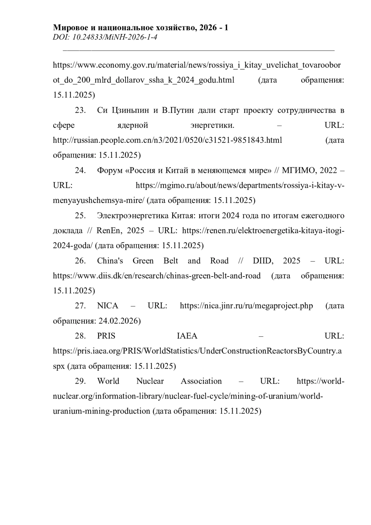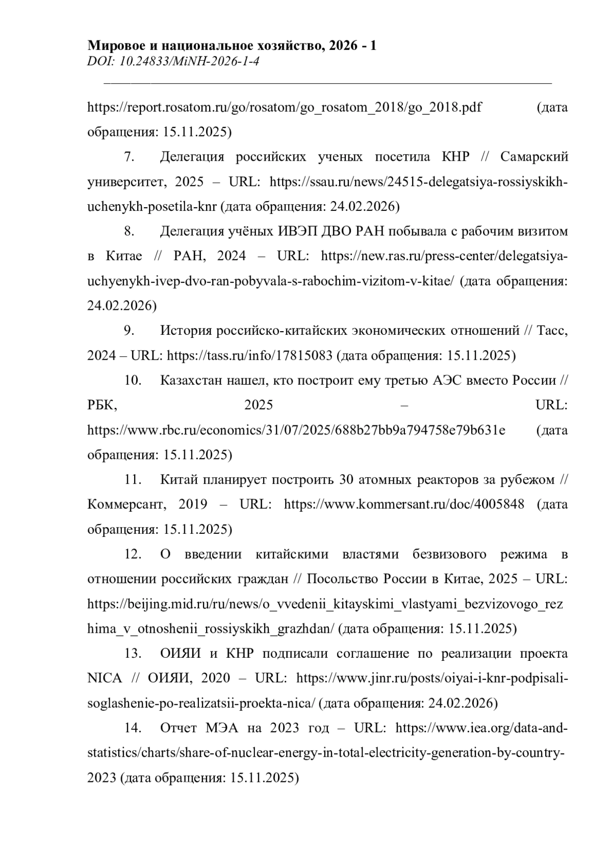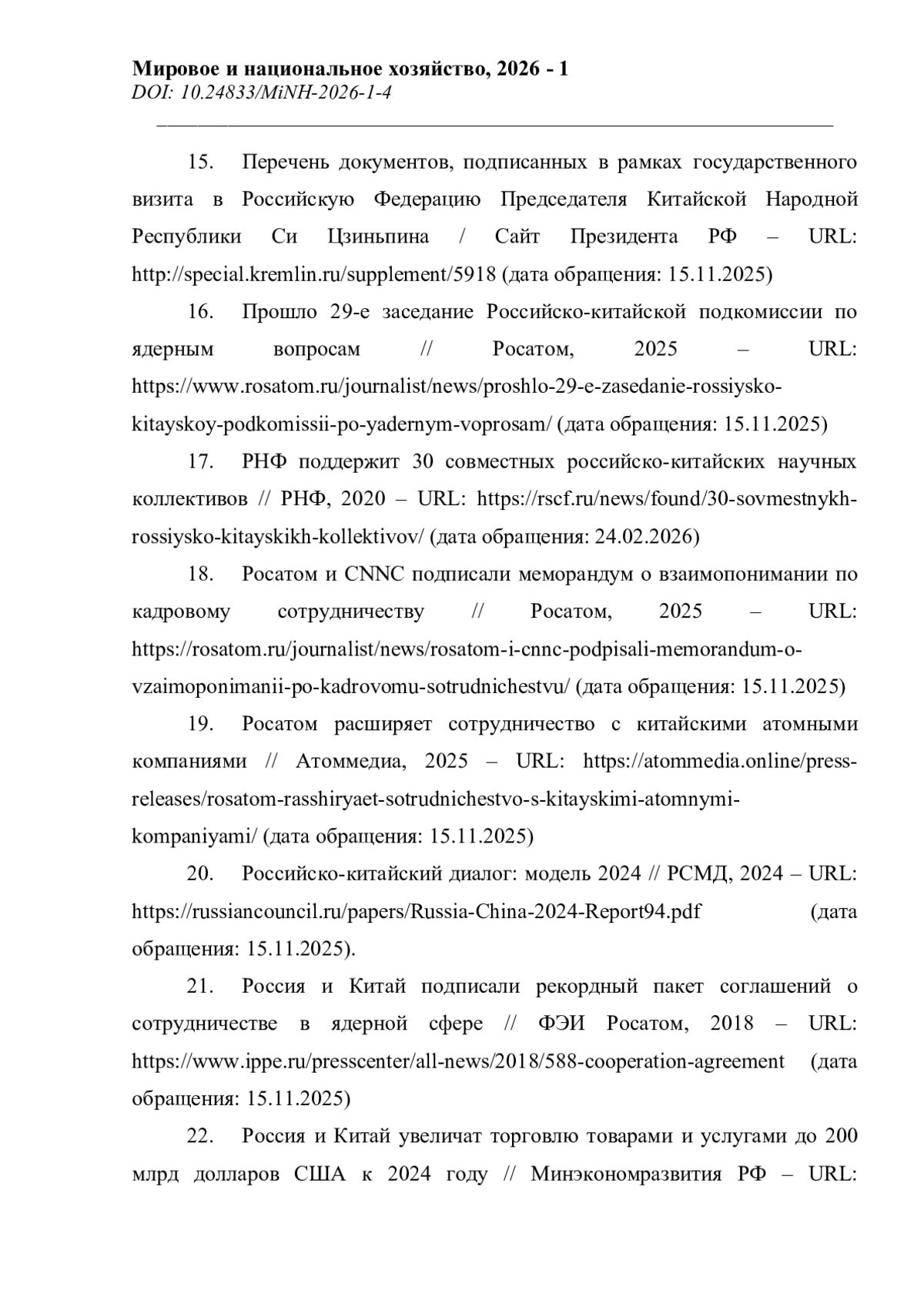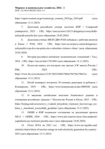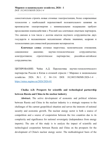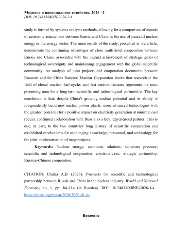 Активное развитие экономических и политических отношений между Россией и Китаем в атомной отрасли является стратегическим ответом на вызовы современной геополитической обстановки и отвечает интересам национальной безопасности и экономического роста. Атомная отрасль энергетики выступает одновременно и предметом соперничества, и предметом сотрудничества стран в силу своей сложности и значимости для государственного суверенитета (независимости от импорта энергетических ресурсов). Целью данного исследования является анализ влияния научно-технологического сотрудничества России и Китая на перспективы развития китайской атомной энергетики. Методологическую основу работы составили методы системного анализа, позволяющего сопоставлять аспекты экономических взаимодействий России и Китая в использовании мирного атома в энергетике. Основные результаты исследования, изложенные в статье, свидетельствуют о сохраняющихся преимуществах тесного многоуровневого сотрудничества России и Китая, связанных с обоюдным достижением стратегических целей технологического суверенитета и сохранения вовлеченности в мировое научное сообщество. Анализ совместных проектов и документов о сотрудничестве между Росатомом и Сhina National Nuclear Corporation показывает, что исследования в области закрытого ядерного топливного цикла и реакторов на быстрых нейтронах составляют наиболее перспективное направление долгосрочного научно-технологического партнерства. Основный вывод касается того, что несмотря на наращивание потенциала Китая в атомной отрасли и возможности самостоятельно строить новые атомные электростанции, более современные технологии с наибольшей перспективой положительного влияния на производство электроэнергии с минимальными издержками требуют продолжения взаимодействия с Россией как ключевым опытным партнером. Это связано в том числе с долгим опытом научного сотрудничества двух государств и налаженными механизмами обмена знаниями, кадрами и технологиями для совместной реализации мегапроектов.