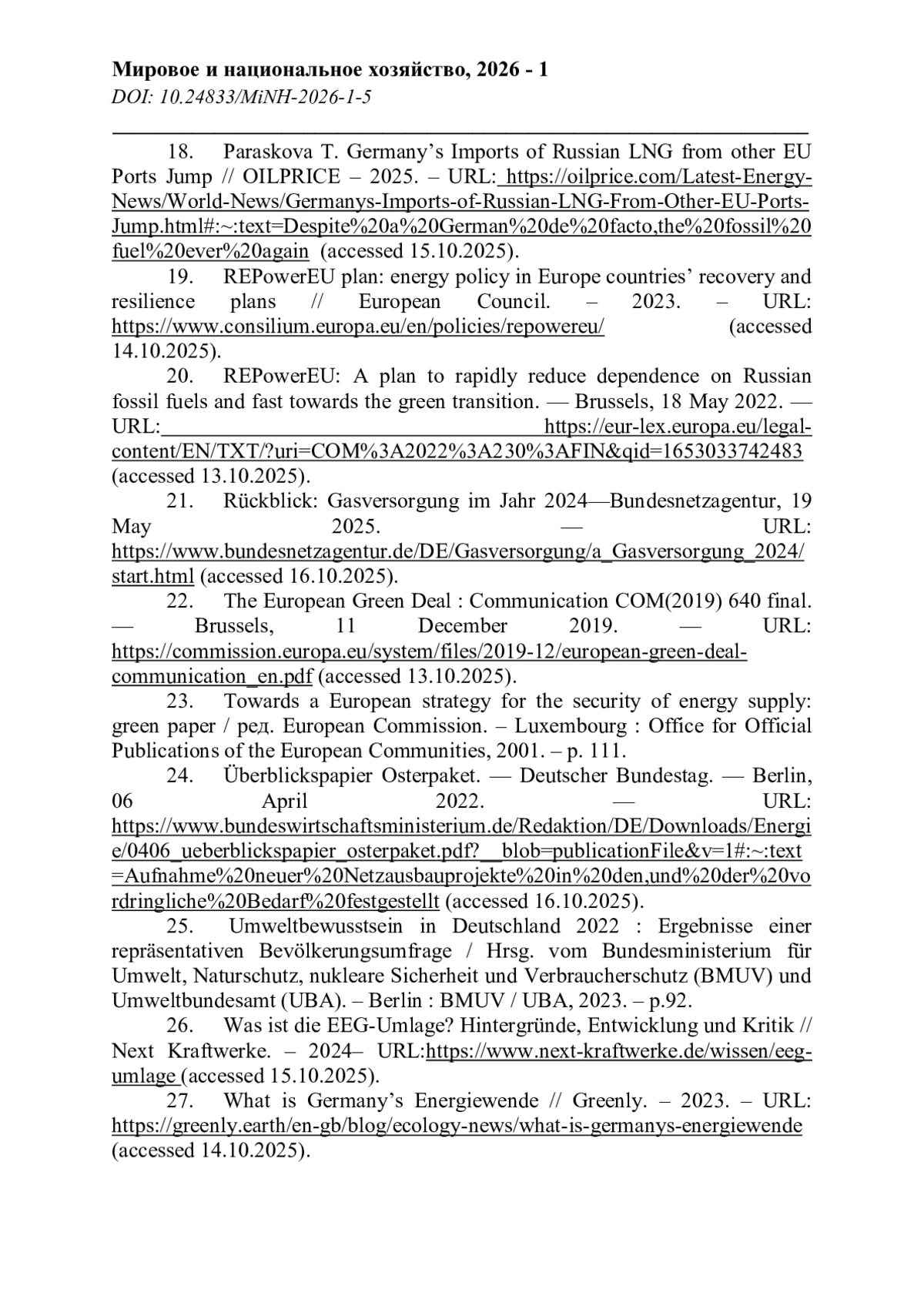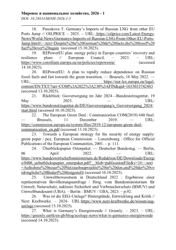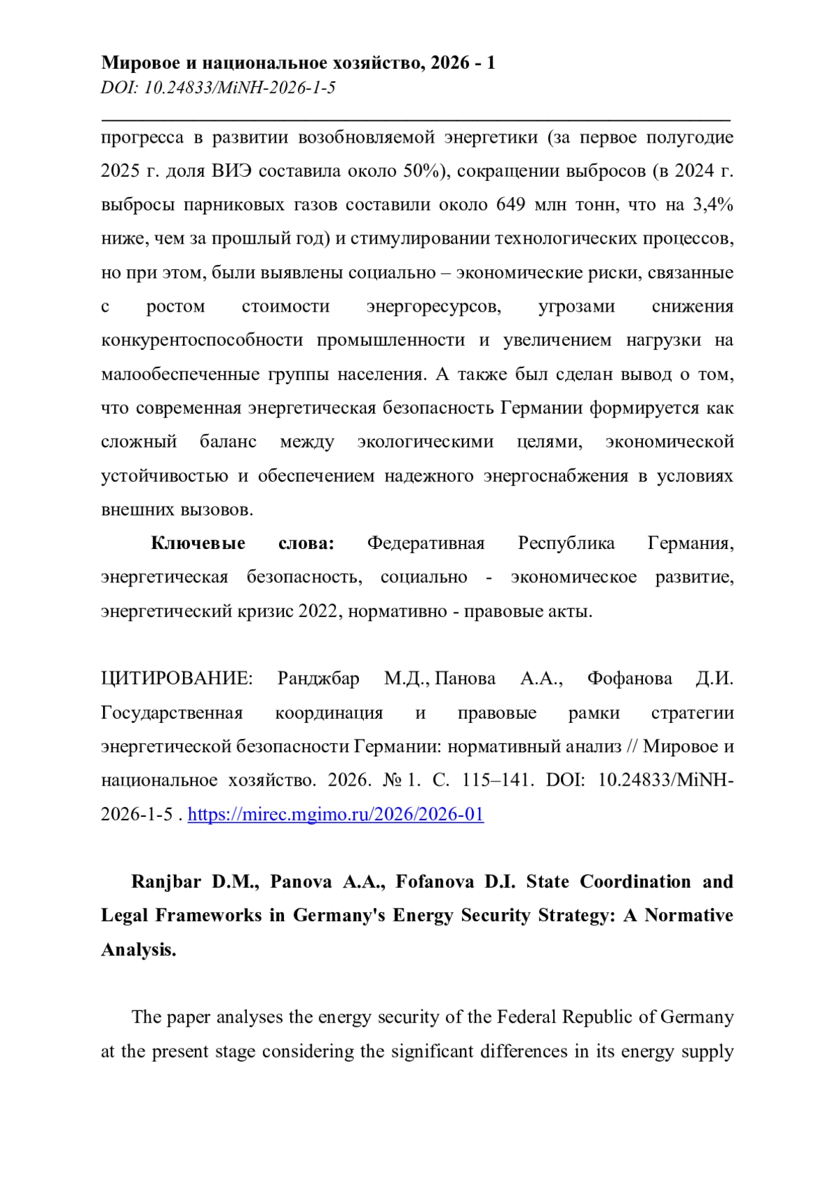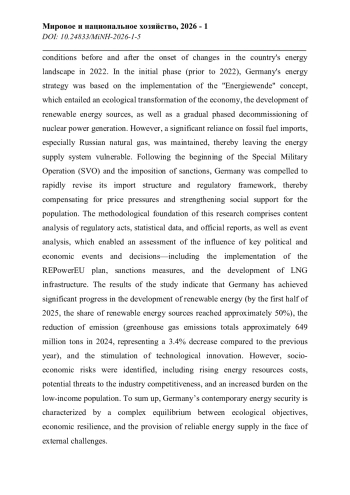 В данной статье анализируется энергетическая безопасность Федеративной Республики Германия на современном этапе с учетом различий в условиях ее обеспечения до 2022 года и после начала изменений энергетической ситуации в стране. На первом этапе (до 2022 г.) энергетическая стратегия Германии основывалась на реализации концепции «Energiewende», предполагающей экологическую трансформацию экономики, развитие возобновляемых источников энергии и постепенный отказ от атомной генерации. Более того, при этом сохранялась высокая зависимость от импорта ископаемых энергоносителей, в особенности российского природного газа, тем самым оставаясь уязвимой в системе энергоснабжения. После начала Специальной Военной Операции и введенные санкций против Российской Федерации, Германия была вынуждена оперативно пересматривать свою структуру импорта и нормативно - правовую базу, компенсировав этим ценовое давление и укрепление социальной поддержки населения. Методологическую основу исследования составили контент - анализ нормативных актов, статистических данных и официальных отчетов, а также ивент - анализ, позволивший оценить влияние ключевых политико - экономических событий и решений - включая внедрение плана REPowerEU, санкционных мер, а также развитие инфраструктуры СПГ. Результаты исследования показали, что Германия достигла значительного прогресса в развитии возобновляемой энергетики (за первое полугодие 2025 г. доля ВИЭ составила около 50%), сокращении выбросов (в 2024 г. выбросы парниковых газов составили около 649 млн тонн, что на 3,4% ниже, чем за прошлый год) и стимулировании технологических процессов, но при этом, были выявлены социально - экономические риски, связанные с ростом стоимости энергоресурсов, угрозами снижения конкурентоспособности промышленности и увеличением нагрузки на малообеспеченные группы населения. А также был сделан вывод о том, что современная энергетическая безопасность Германии формируется как сложный баланс между экологическими целями, экономической устойчивостью и обеспечением надежного энергоснабжения в условиях внешних вызовов.