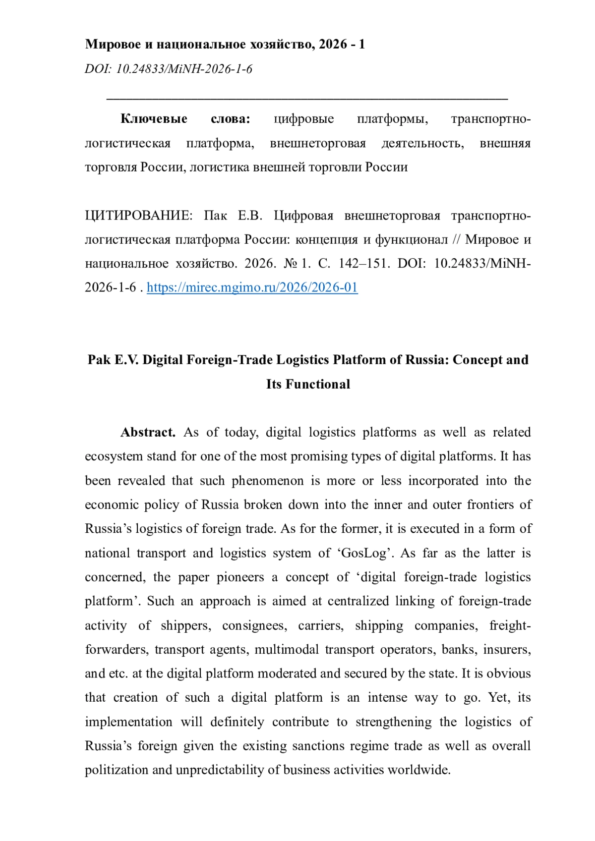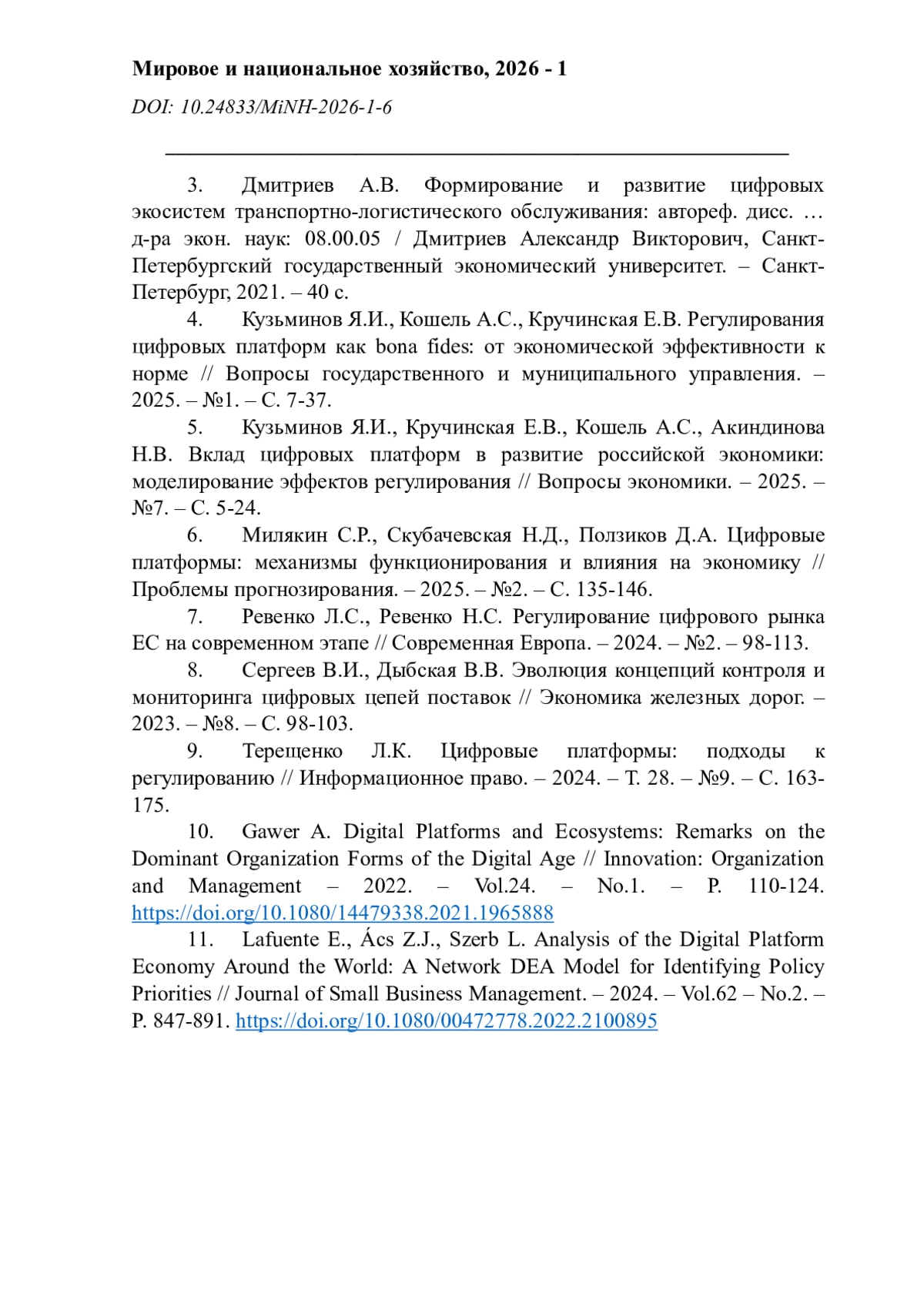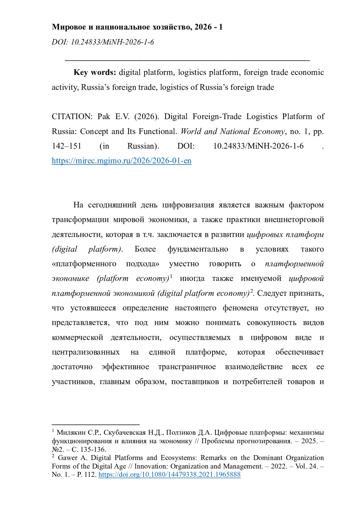 На сегодняшний день цифровизация является важным фактором трансформации мировой экономики, а также практики внешнеторговой деятельности, которая в т. ч. заключается в развитии цифровых платформ (digital platform). Более фундаментально в условиях такого «платформенного подхода» уместно говорить о платформенной экономике (platform economy)1 иногда также именуемой цифровой платформенной экономикой (digital platform economy)2.