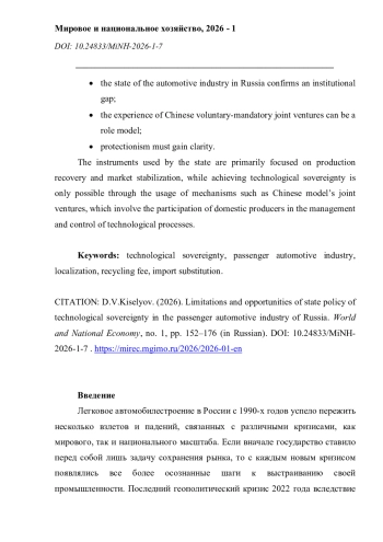 4. Меренков, А. О. Обеспечение технологического суверенитета в автомобильной промышленности России: проблемные вопросы и сценарии развития / А. О. Меренков // Инновации и инвестиции. - 2023. - № 1.