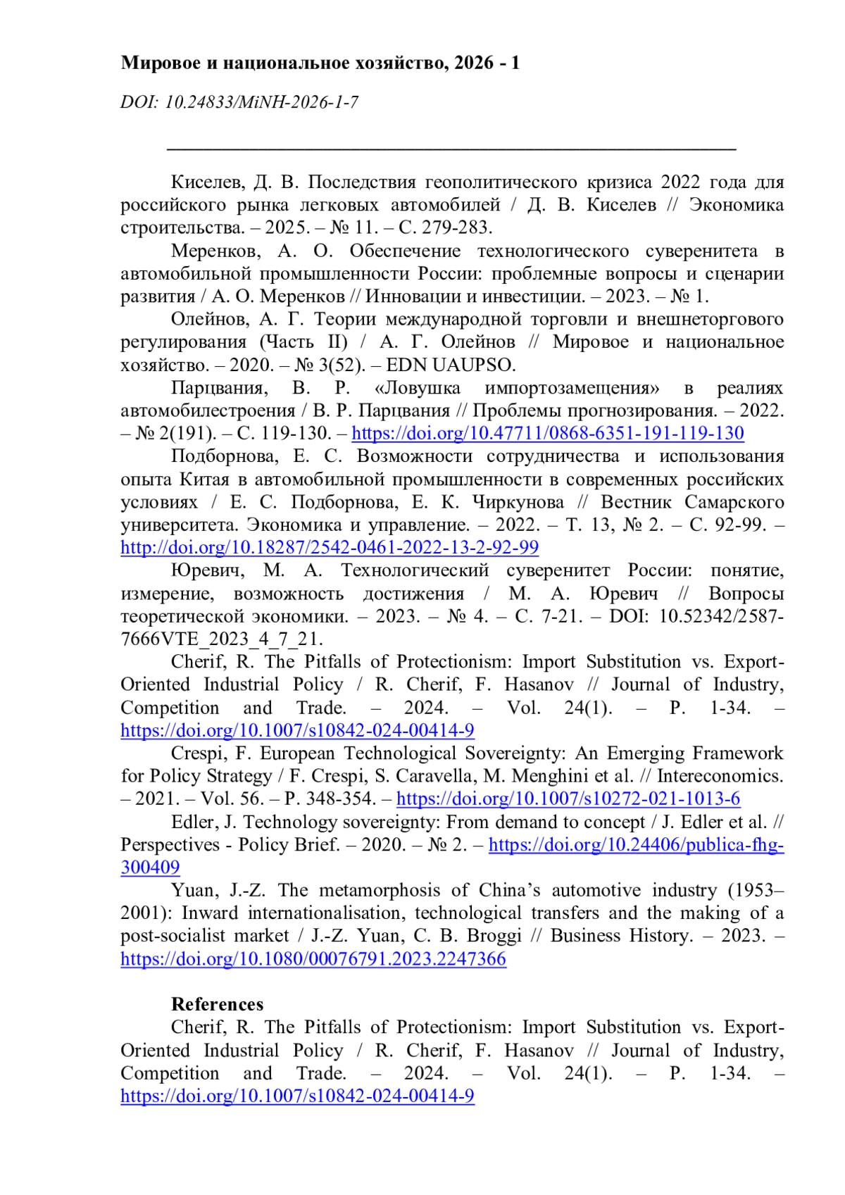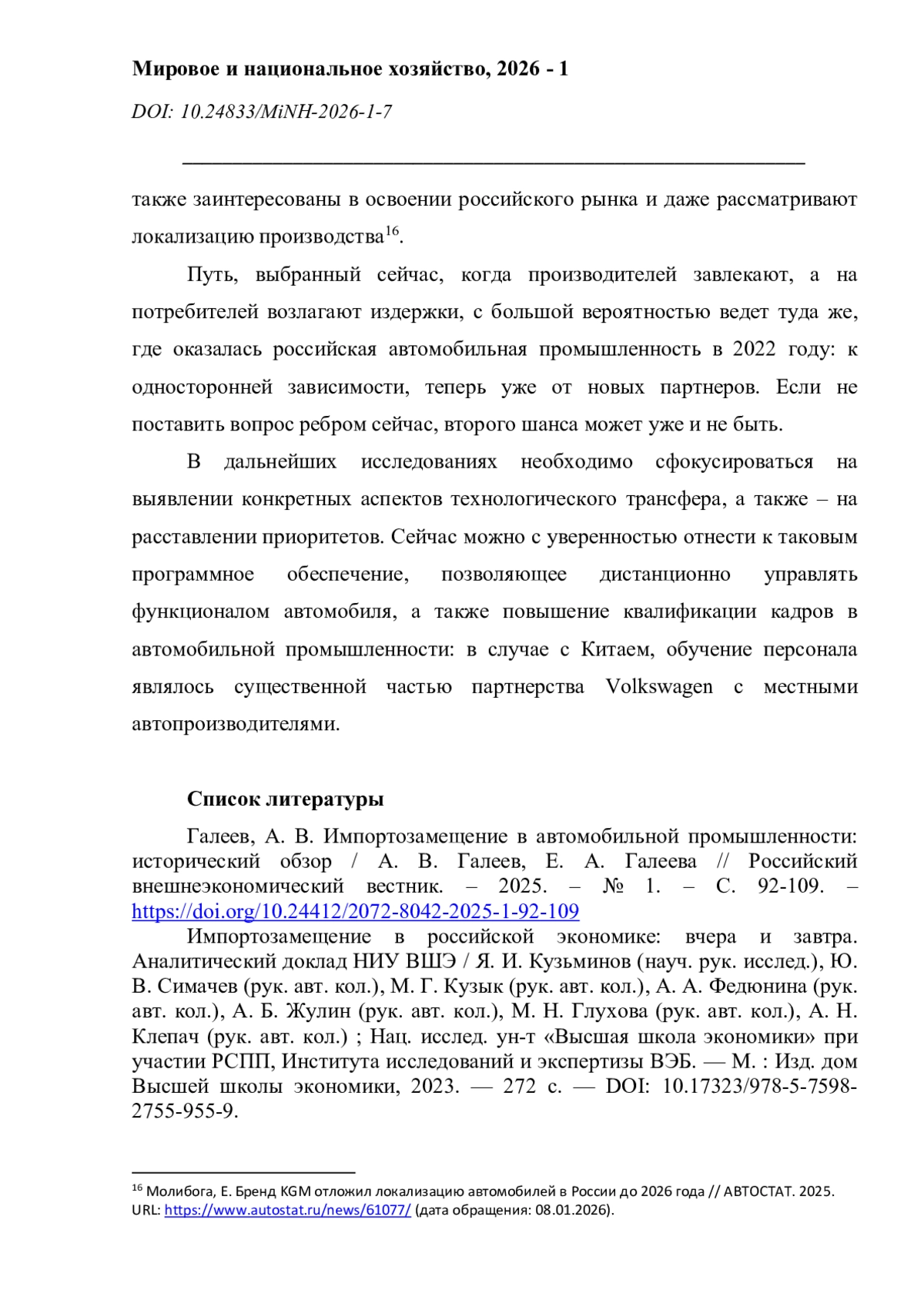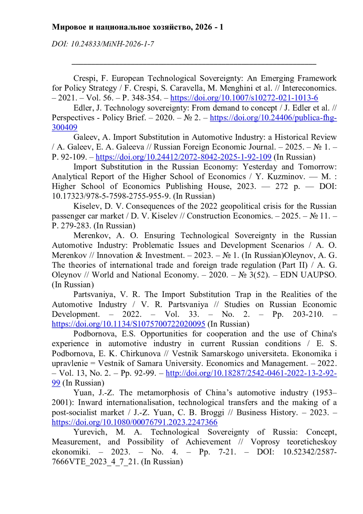 1. Галеев, А. В. Импортозамещение в автомобильной промышленности: исторический обзор / А. В. Галеев, Е. А. Галеева // Российский внешнеэкономический вестник. - 2025. - № 1. - С. 92-109. - https://doi.org/10.24412/2072-8042-2025-1-92-109.