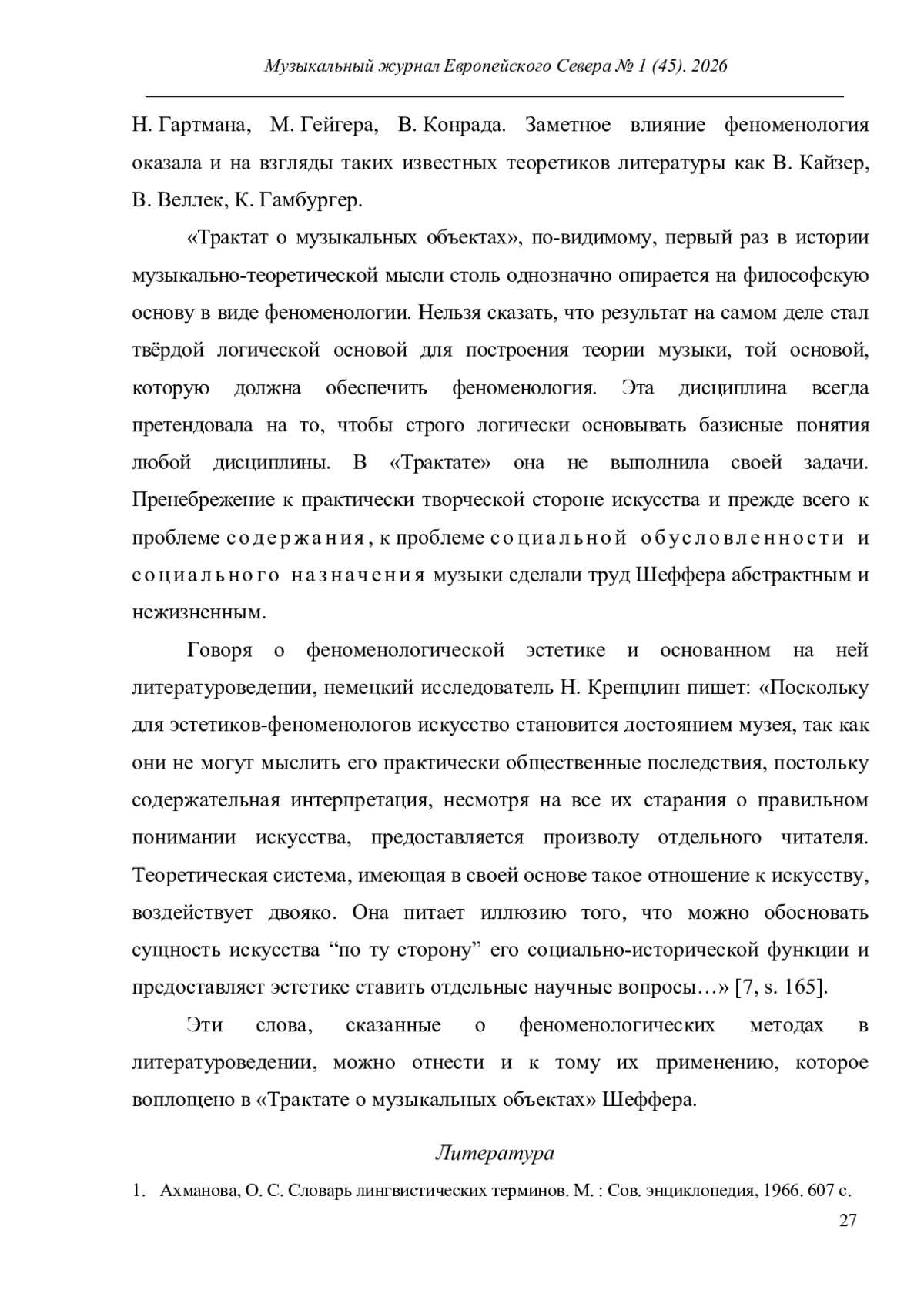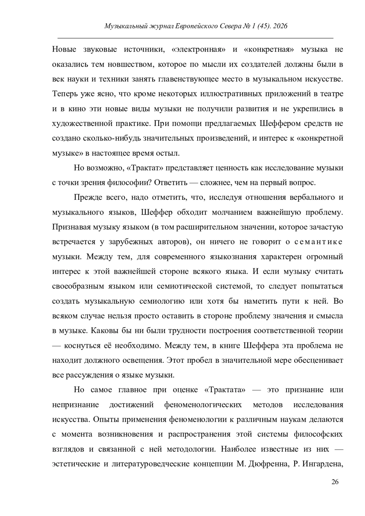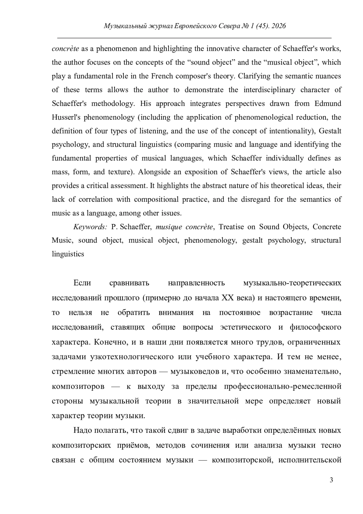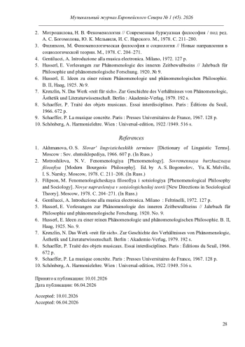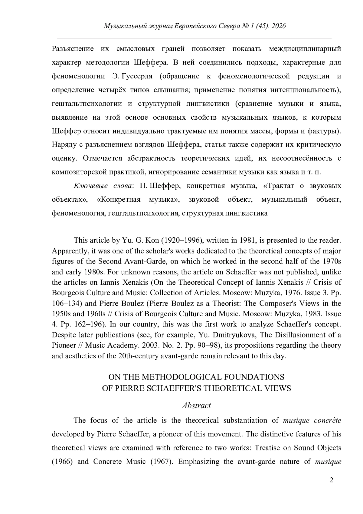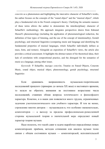 В центре внимания автора статьи находится обоснование конкретной музыки, принадлежащее Пьеру Шефферу, пионеру этого направления. Особенности его теоретических взглядов показаны с опорой на два труда - «Трактат о звуковых объектах» (1966) и «Конкретная музыка» (1967). Акцентируя авангардный характер конкретной музыки как явления и отмечая новаторский характер трудов Шеффера, автор фокусирует своё внимание на понятиях звукового и музыкального объектов, играющих в концепции французского композитора фундаментальную роль. Разъяснение их смысловых граней позволяет показать междисциплинарный характер методологии Шеффера. В ней соединились подходы, характерные для феноменологии Э. Гуссерля (обращение к феноменологической редукции и определение четырёх типов слышания; применение понятия интенциональность), гештальтпсихологии и структурной лингвистики (сравнение музыки и языка, выявление на этой основе основных свойств музыкальных языков, к которым Шеффер относит индивидуально трактуемые им понятия массы, формы и фактуры). Наряду с разъяснением взглядов Шеффера, статья также содержит их критическую оценку. Отмечается абстрактность теоретических идей, их несоотнесённость с композиторской практикой, игнорирование семантики музыки как языка и т. п.