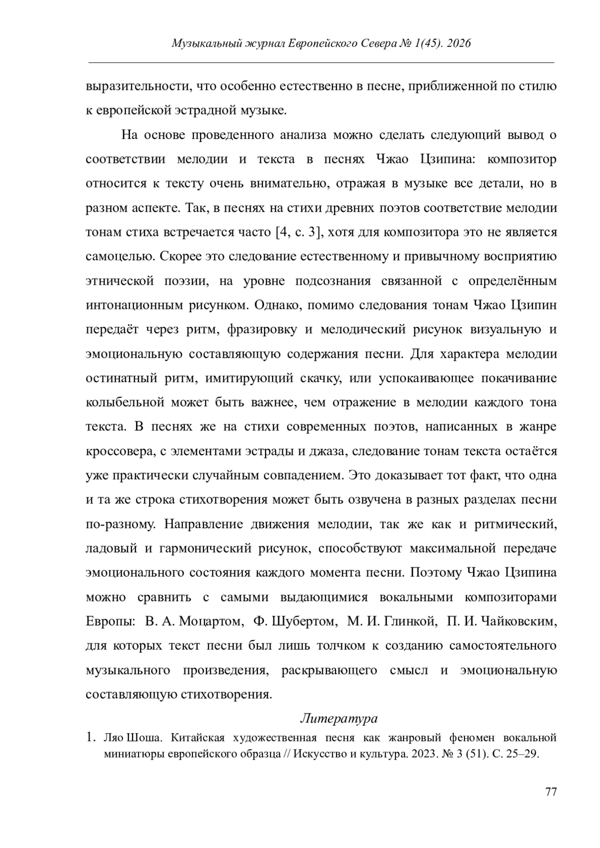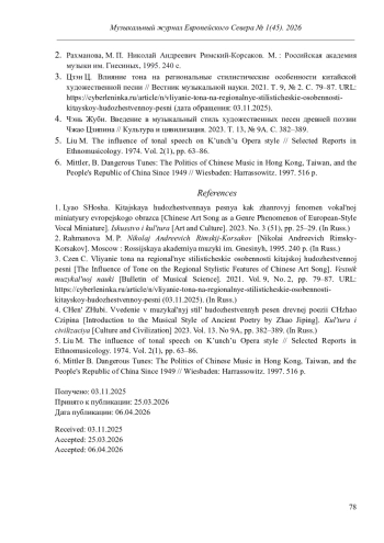 В данной статье соотношение иероглифических тонов и мелодии рассмотрены в разных контекстах: в рамках одного сочинения - песни Чжао Цзипина «Гуань Цзюй» и на примере большого корпуса песен композитора, в которых внимание исследователей сконцентрировано на вариантах интонирования только двух, часто употребляемых слов «мама» («мать») и «любовь». Проделанный анализ показал, что движение мелодии в песнях Чжао Цзипина отражает не столько тоны иероглифов, сколько общий характер, образ или эмоцию, заключённые в стихотворении.