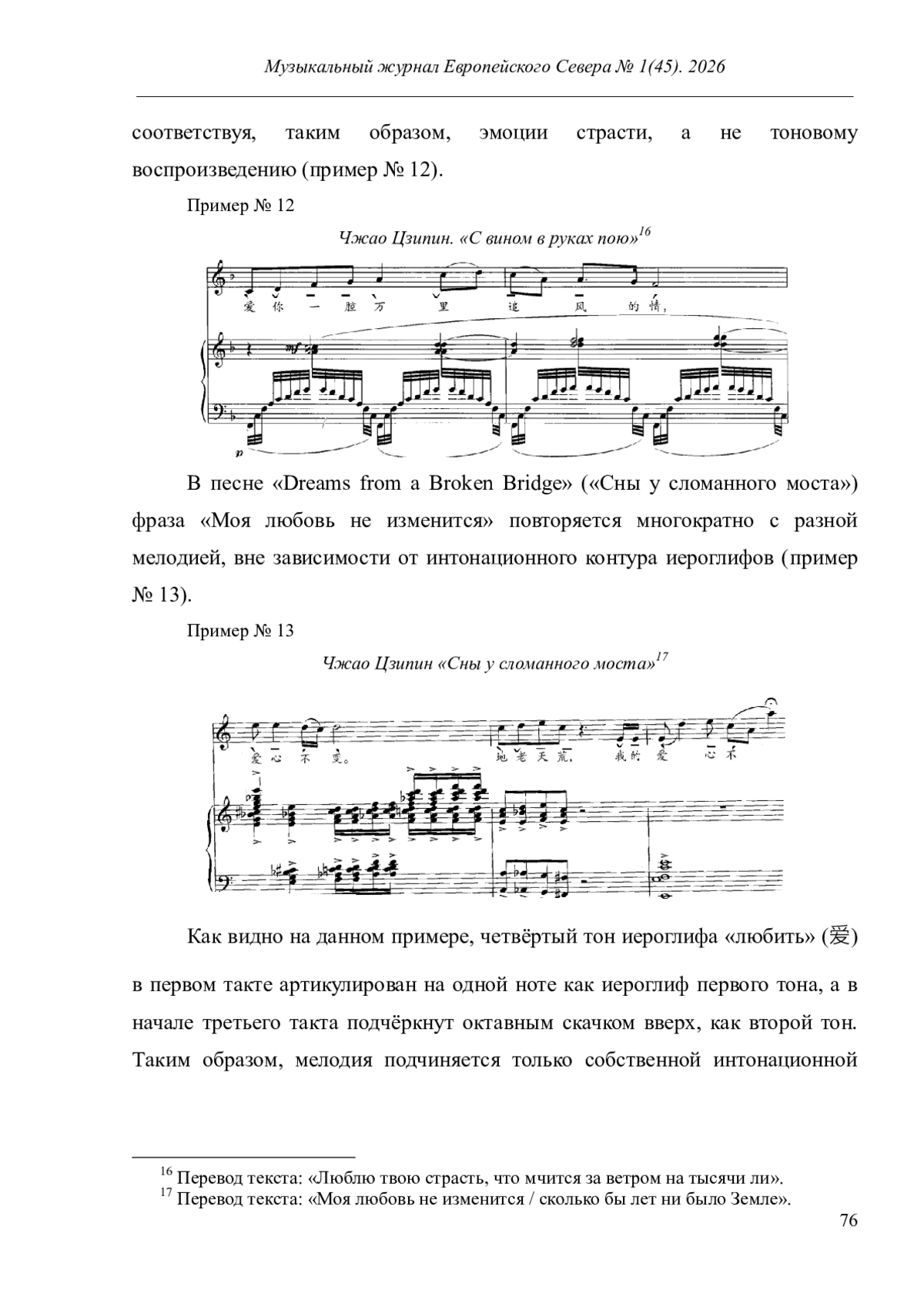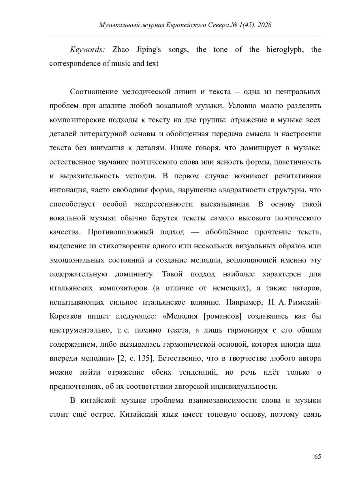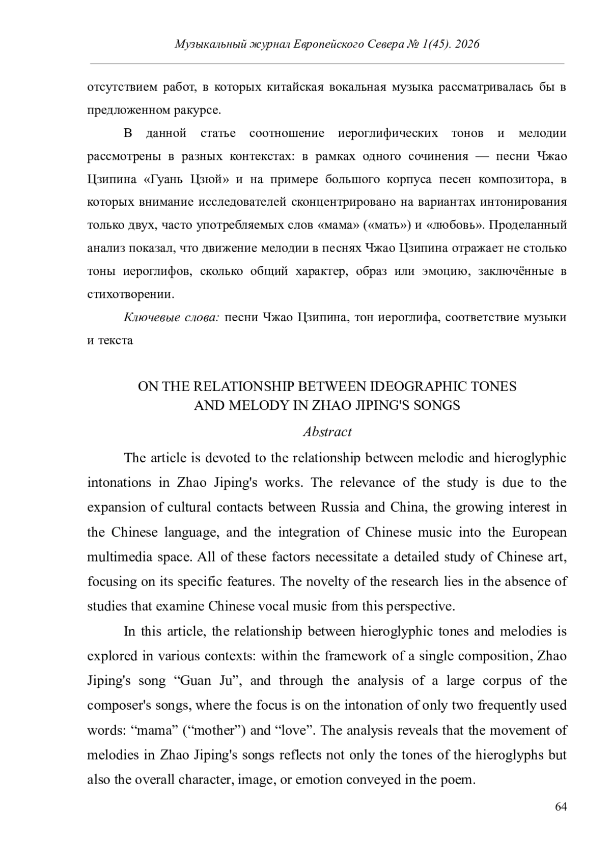 Статья посвящена соотношению мелодической и иероглифической интонаций в песенном творчестве Чжао Цзипина. Актуальность работы обусловлена расширением культурных контактов России и Китая, ростом интереса к китайскому языку, интеграцией китайской музыки в европейское мультимедийное пространство. Все перечисленные факторы заставляют изучать искусство Китая в деталях, обращая внимание на его специфику. Новизна исследования обусловлена отсутствием работ, в которых китайская вокальная музыка рассматривалась бы в предложенном ракурсе.