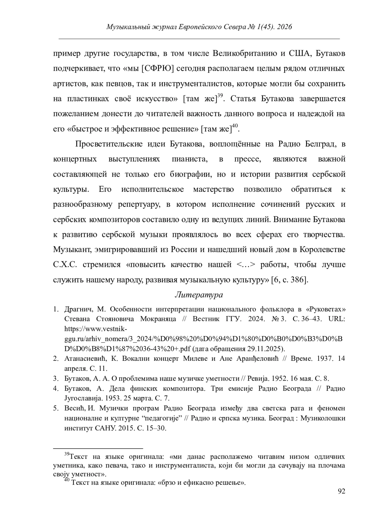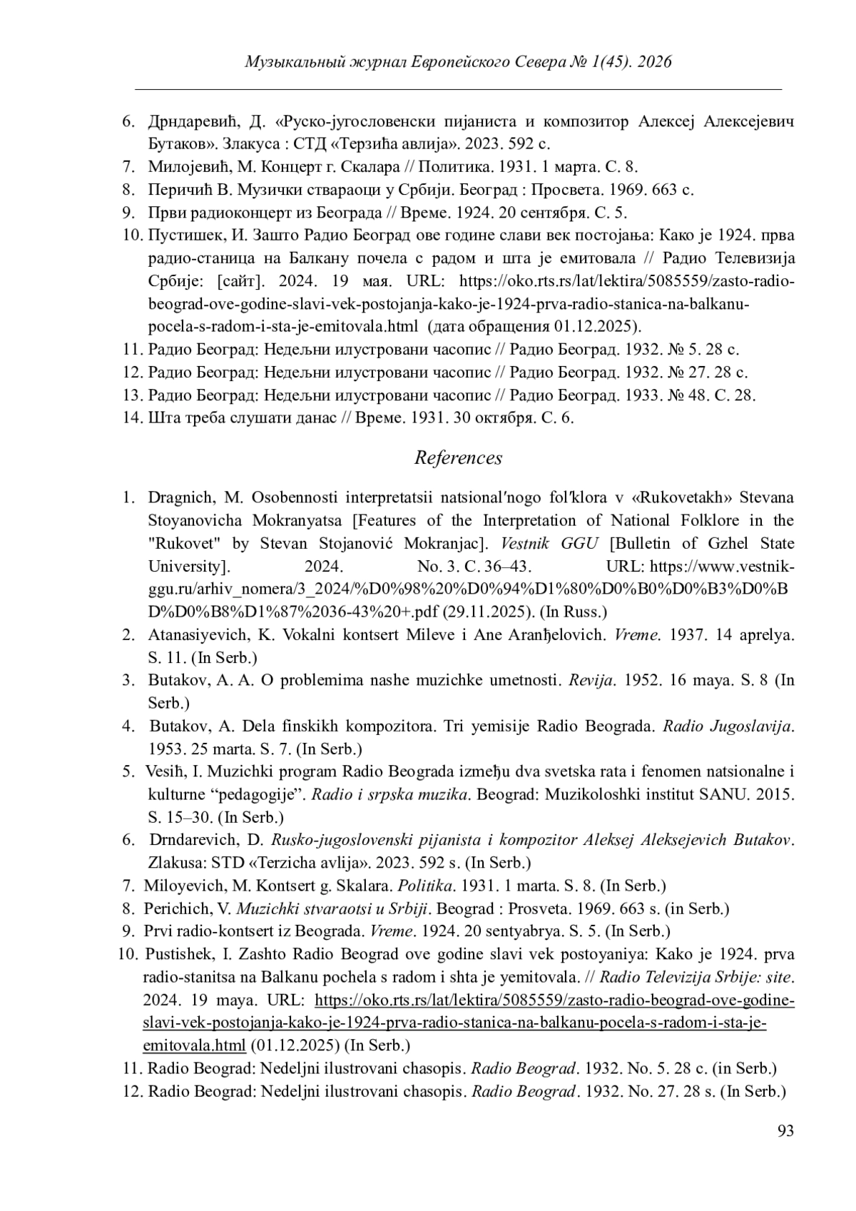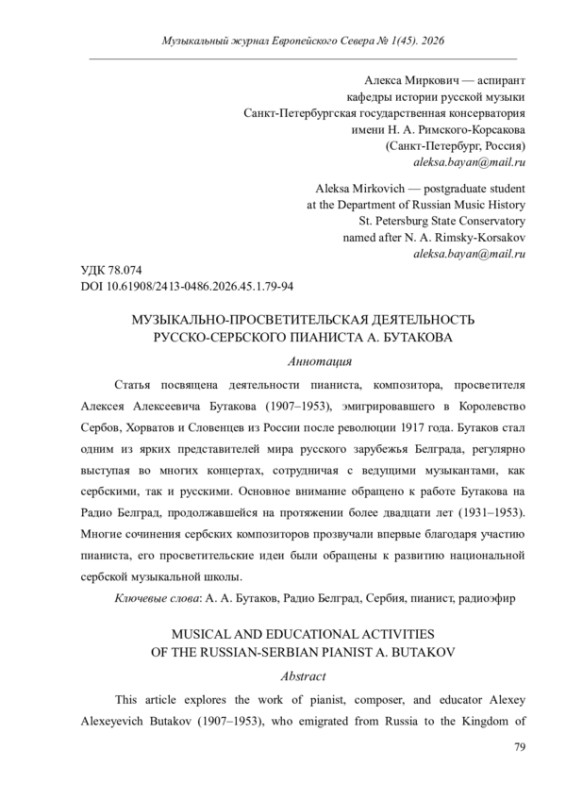 Статья посвящена деятельности пианиста, композитора, просветителя Алексея Алексеевича Бутакова (1907 1953), эмигрировавшего в Королевство Сербов, Хорватов и Словенцев из России после революции 1917 года. Бутаков стал одним из ярких представителей мира русского зарубежья Белграда, регулярно выступая во многих концертах, сотрудничая с ведущими музыкантами, как сербскими, так и русскими. Основное внимание обращено к работе Бутакова на Радио Белград, продолжавшейся на протяжении более двадцати лет (1931 1953). Многие сочинения сербских композиторов прозвучали впервые благодаря участию пианиста, его просветительские идеи были обращены к развитию национальной сербской музыкальной школы.