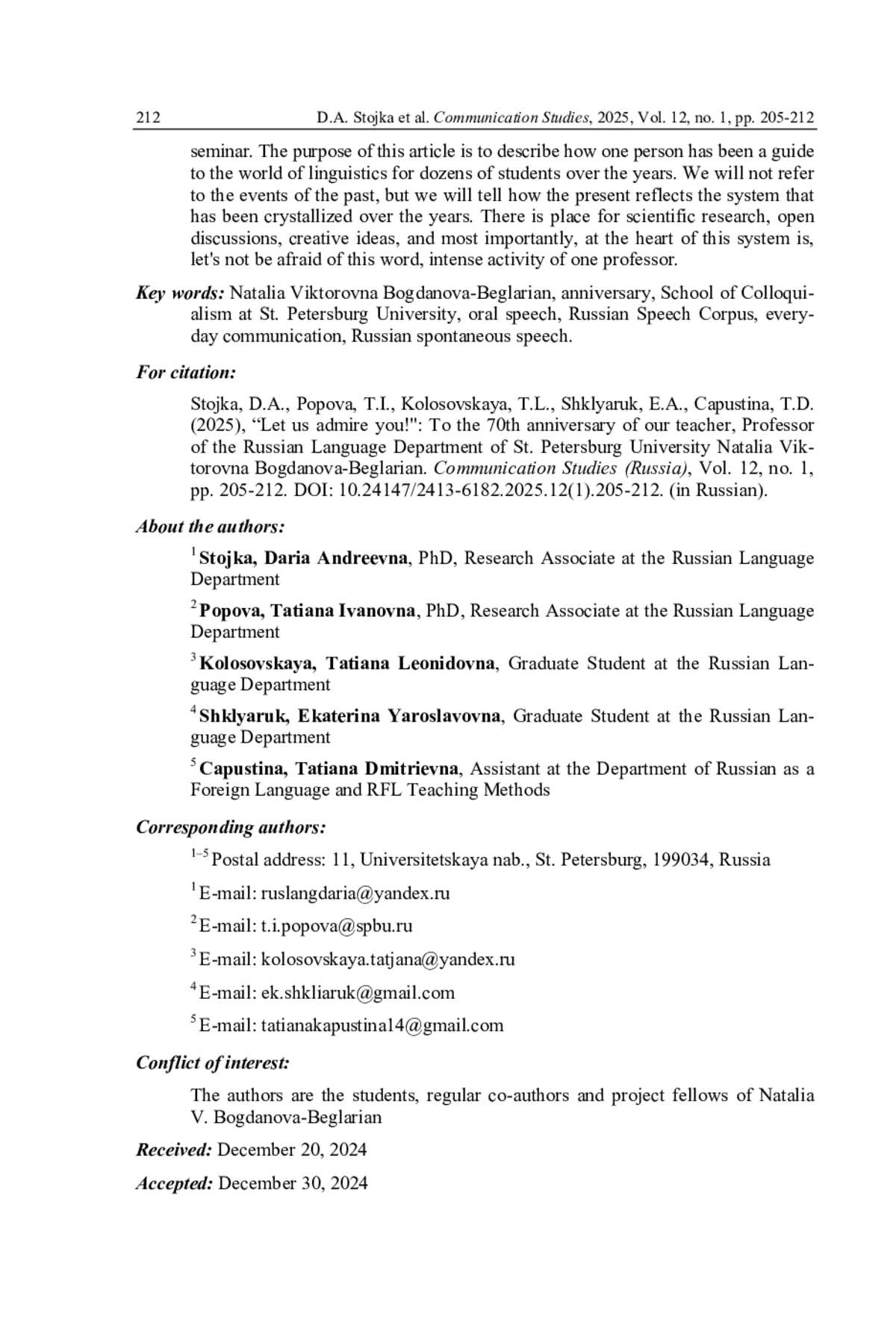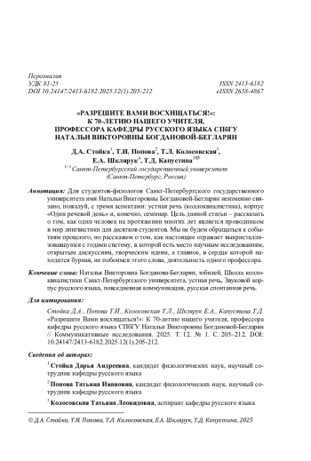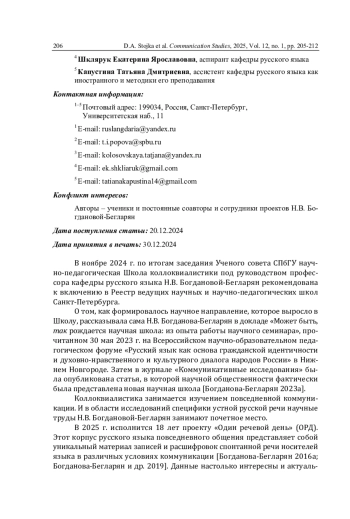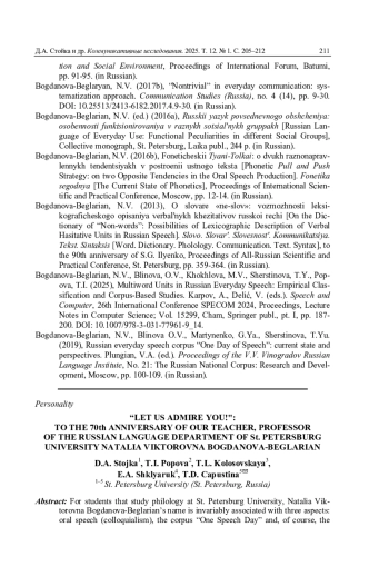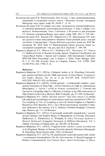 1. Богданова-Бегларян Н В. Коллоквиалистика в Санкт-Петербургском государственном университете: прошлое, настоящее и будущее (к 300-летию Alma Mater) // Коммуникативные исследования. 2023а. Т. 10. № 4. С. 851-859. DOI: 10.24147/2413-6182.2023.10(4).851-859 EDN: HETBZE