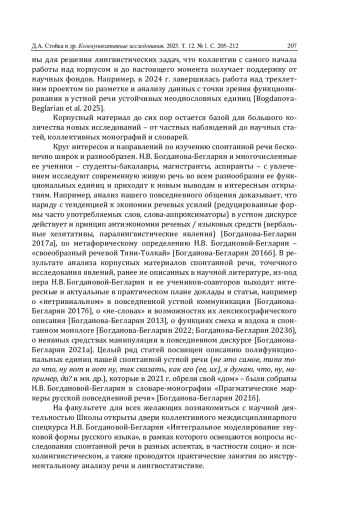 12. Bogdanova-Beglarian N.V., Blinova O.V., Khokhlova M.V., Sherstinova T.Y., Popova T.I. Multiword Units in Russian Everyday Speech: Empirical Classification and Corpus-Based Studies // Speech and Computer: 26th International Conference SPECOM 2024: Proceedings / eds. A. Karpov, V. Delić. Cham: Springer, 2025. Pt. I. P. 187-200. (Lecture Notes in Computer Science; Vol. 15299). DOI: 10.1007/978-3-031-77961-9_14