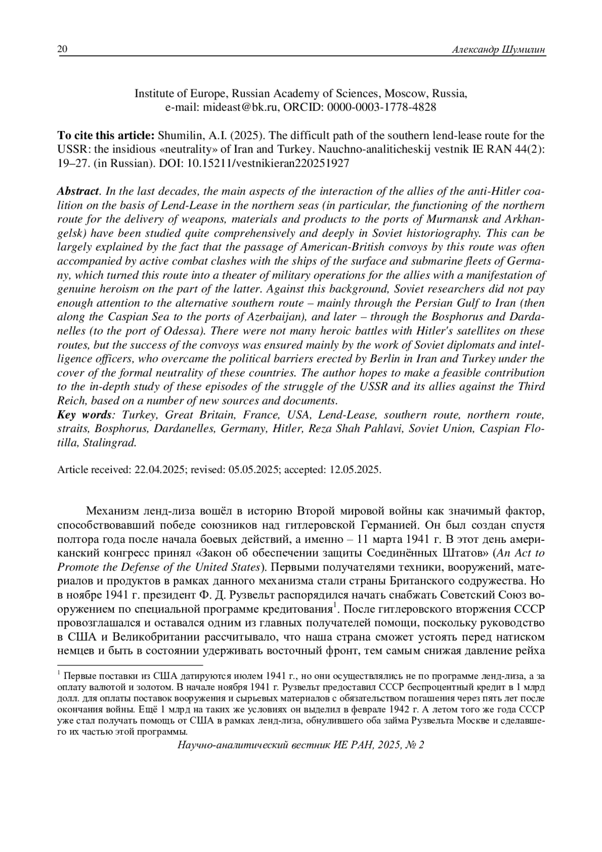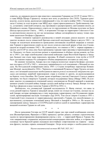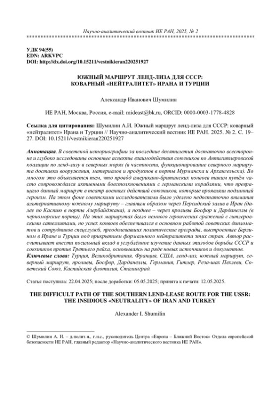 В советской историографии за последние десятилетия достаточно всесторонне и глубоко исследованы основные аспекты взаимодействия союзников по Антигитлеровской коалиции по ленд-лизу в северных морях (в частности, функционирование северного маршрута доставки вооружения, материалов и продуктов в порты Мурманска и Архангельска). Во многом это объясняется тем, что провóд американо-британских конвоев таким путём часто сопровождался активными боестолкновениями с германскими кораблями, что превращало данный маршрут в театр военных действий союзников, которые проявляли подлинный героизм. На этом фоне советскими исследователями было уделено недостаточно внимания альтернативному южному маршруту – главным образом через Персидский залив в Иран (далее по Каспию в порты Азербайджана), а позднее – через проливы Босфор и Дарданеллы (в черноморские порты). На этих маршрутах было немного героических сражений с гитлеровскими сателлитами, но успех конвоев обеспечивался в основном работой советских дипломатов и сотрудников спецслужб, преодолевавших политические преграды, выстроенные Берлином в Иране и Турции под прикрытием формального нейтралитета этих стран. Автор рассчитывает внести посильный вклад в углублённое изучение данных эпизодов борьбы СССР и союзников против Третьего рейха, основываясь на ряде новых источников и документов