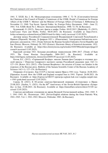 15. Операция “Согласие”. Как СССР и Англия заняли Иран в 1941 году. Topwar. 26.08.2021. [Operation Accord. How the USSR and England occupied Iran in 1941. Topwar. 26.08.2021. (In Russian)]. Available at: https://topwar.ru/186337-operacija-soglasie-kak-sssr-i-anglija-zanjali-iran-v-1941-godu.html (accessed 12.05.2025).