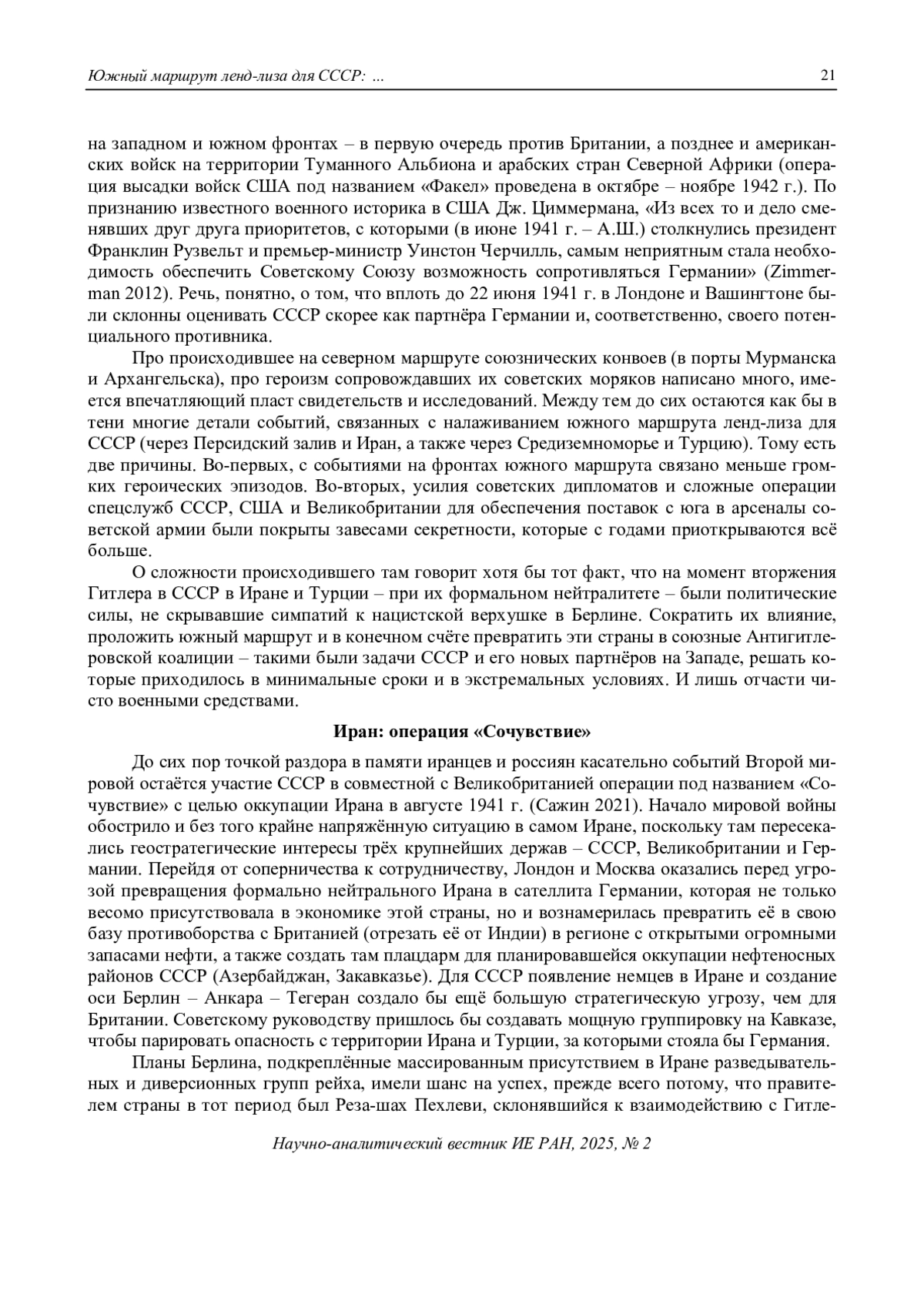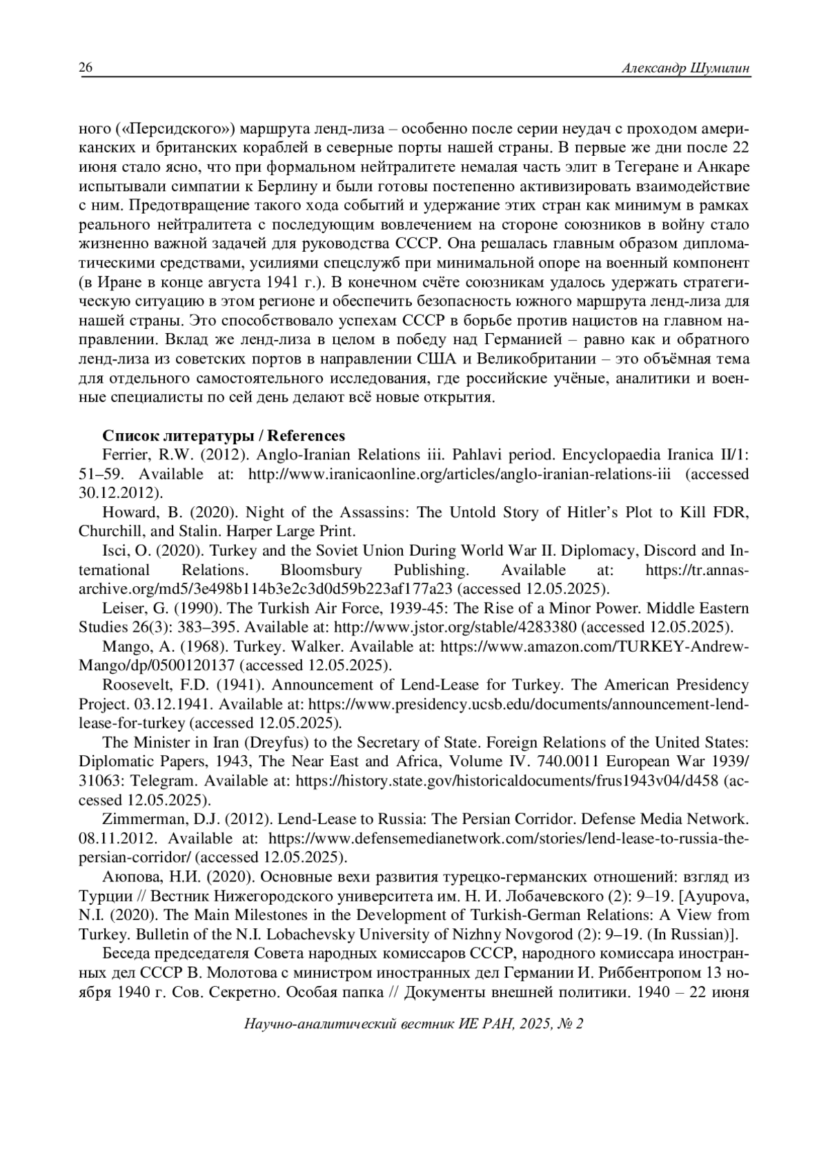 16. Сажин, В. (2021). К 80-летию советско-британской операции “Сочувствие” в Иране. 25.08.2021. [Sazhin, V. (2021). On the 80th Anniversary of the Soviet-British Operation “Sympathy” in Iran. 25.08.2021. (In Russian)]. Available at: https://interaffairs.ru/news/show/31320 (accessed 12.05.2025).
