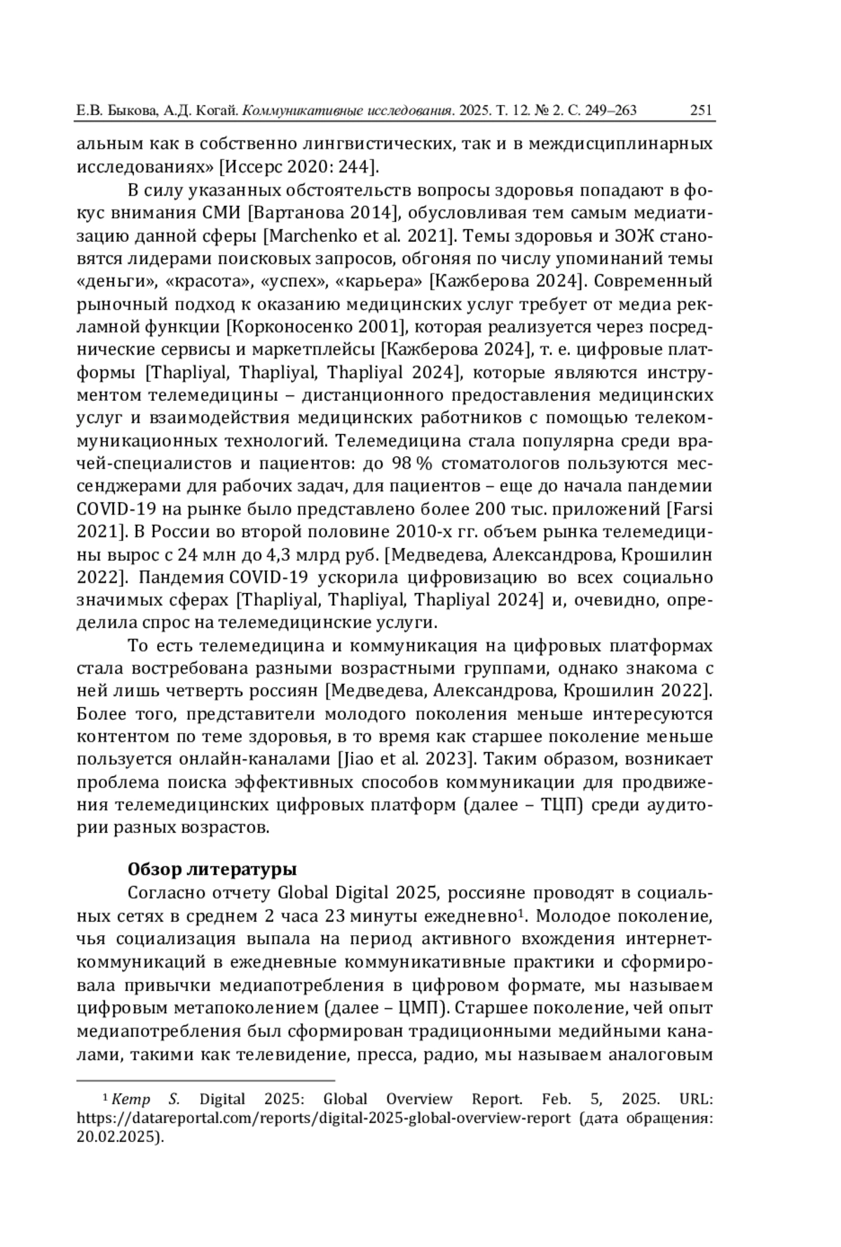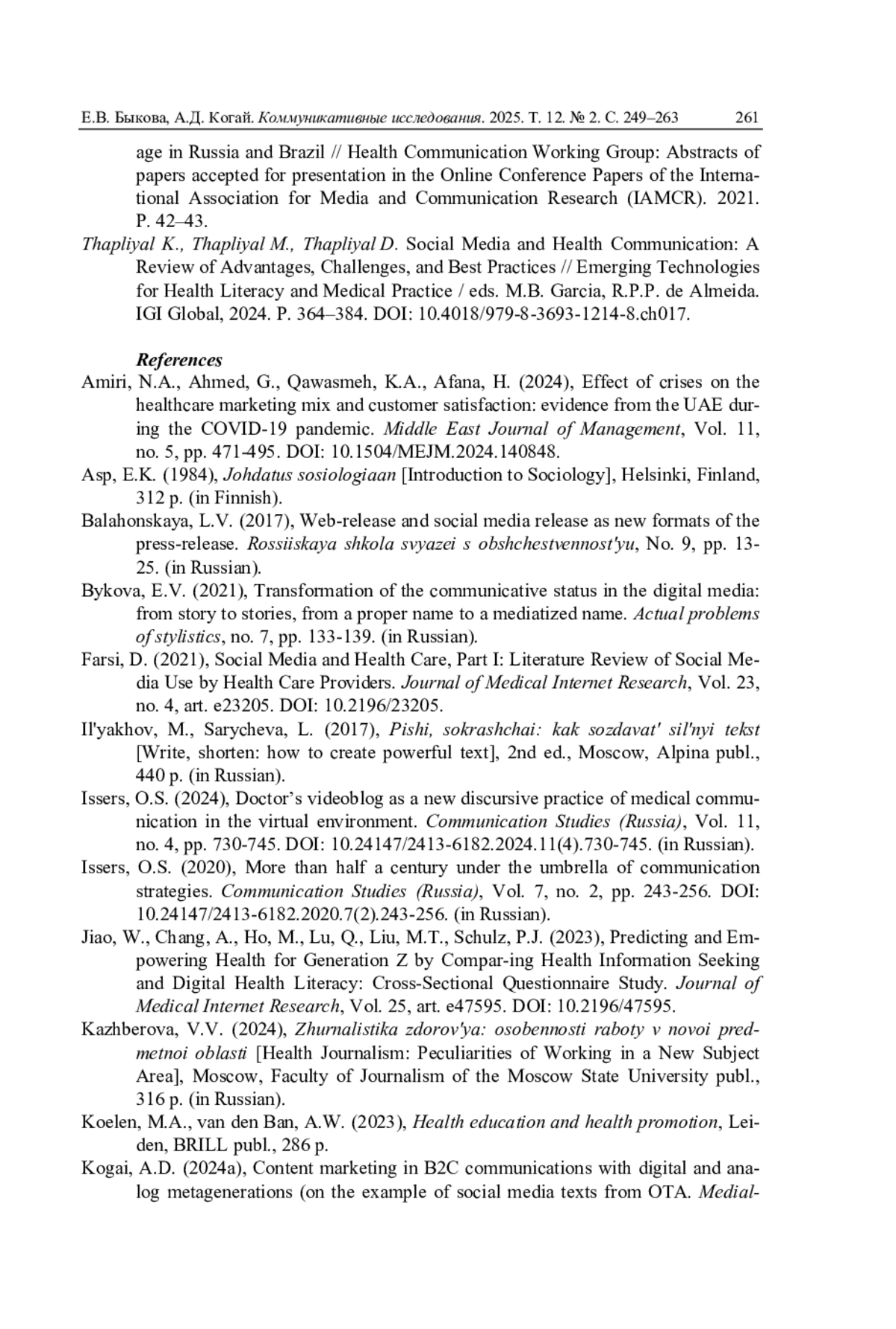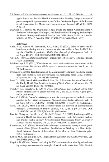6. Иссерс О.С. Видеоблог врача как новая дискурсивная практика медицинского общения в виртуальной среде // Коммуникативные исследования. 2024. Т. 11. № 4. С. 730-745. DOI: 10.24147/2413-6182.2024.11(4).730-745 EDN: EEPJQV