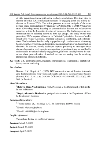 Альтернативой добровольного медицинского страхования становятся телемедицинские цифровые платформы (ТЦП). Проблема массового вовлечения в их использование обусловлена низким интересом молодежи к вопросам здоровья и предубеждением старшего поколения к платным медицинским онлайн-консультациям. Цель исследования - идентификация способов B2C-коммуникаций с молодежной и старшей аудиторией на российских ТЦП. В статье проведен контент-анализ наиболее популярных социомедиарелизов российских ТЦП за 2020-2024 гг. в соцсетях (90 единиц анализа, 630 единиц счета) на предмет выявления форм коммуникации и ценностных нарративов в речевой структуре сообщений, чтобы определить формы подачи контента для обеих возрастных групп. Проведенное исследование показало, что для продвижения ТЦП рекомендуется соблюдение принципов «инфостиля», использование поликодовых текстов («карточек»), технологий личного брендинга, сторителлинга, коллабораций. Молодежная аудитория активно вовлекается в коммуникацию на тему красоты и здоровья, психологии, правильного питания в коротких текстах с элементами юмора и приемов геймификации. Старшая аудитория позитивно реагирует на сообщения о диагностике и первых признаках заболеваний, способах профилактики и укрепления здоровья. Более интенсивное вовлечение старшей аудитории в ТЦП требует продвижения нарративов о персонализации медицинских услуг и экономии времени для получения профессиональной онлайн-консультации
