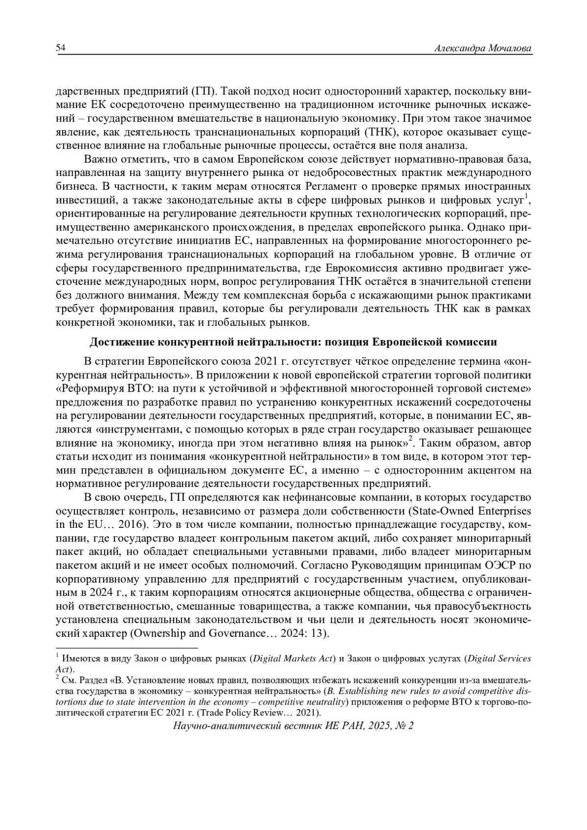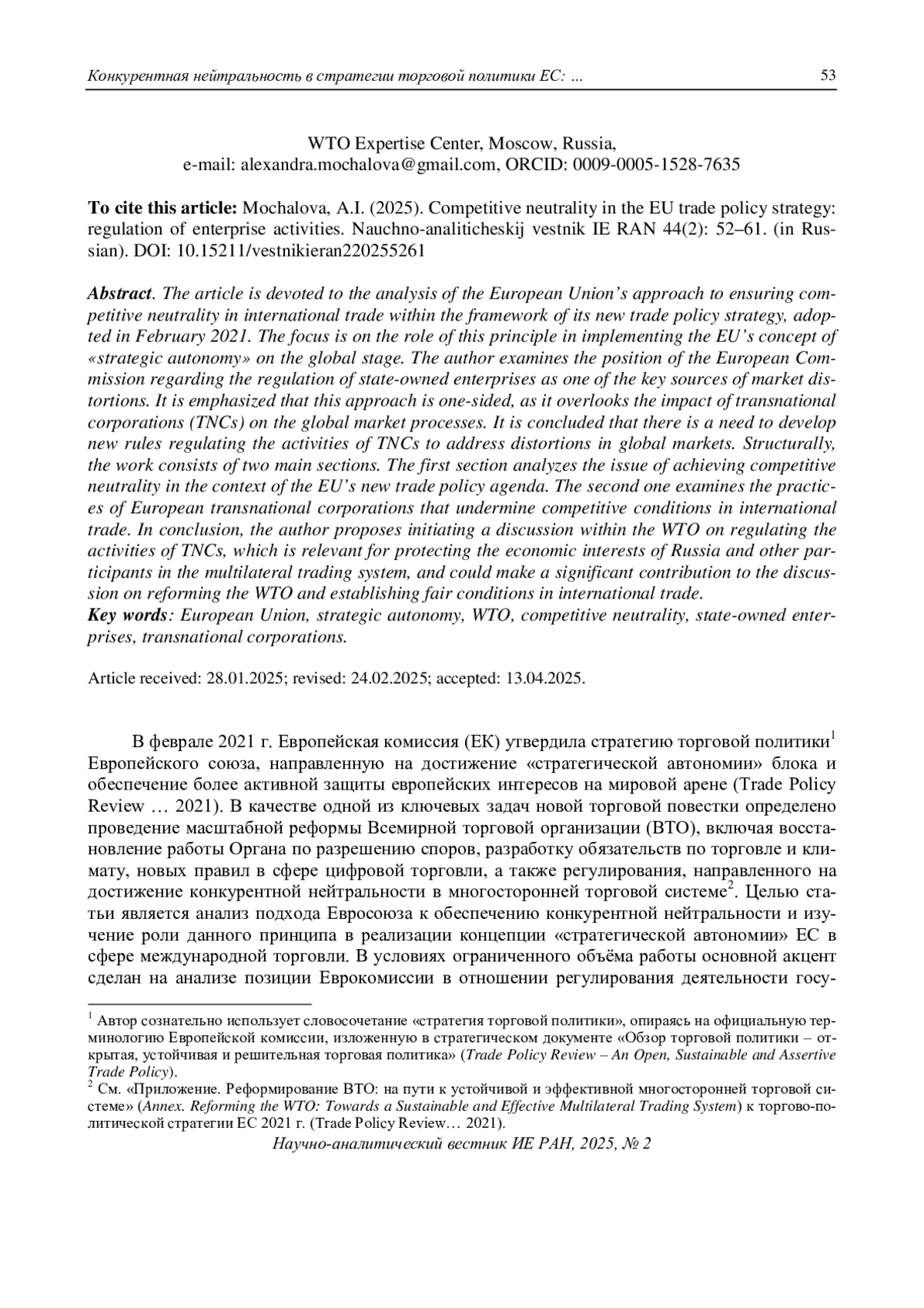 В феврале 2021 г. Европейская комиссия (ЕК) утвердила стратегию торговой политики1 Европейского союза, направленную на достижение «стратегической автономии» блока и обеспечение более активной защиты европейских интересов на мировой арене (Trade Policy Review… 2021). В качестве одной из ключевых задач новой торговой повестки определено проведение масштабной реформы Всемирной торговой организации (ВТО), включая восстановление работы Органа по разрешению споров, разработку обязательств по торговле и климату, новых правил в сфере цифровой торговли, а также регулирования, направленного на достижение конкурентной нейтральности в многосторонней торговой системе2. Целью статьи является анализ подхода Евросоюза к обеспечению конкурентной нейтральности и изучение роли данного принципа в реализации концепции «стратегической автономии» ЕС в сфере международной торговли.