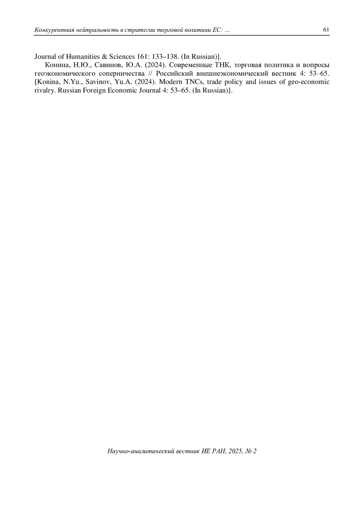 26. Конина, Н.Ю., Савинов, Ю.А. (2024). Современные ТНК, торговая политика и вопросы геоэкономического соперничества //Российский внешнеэкономический вестник 4: 53-65. [Konina, N.Yu., Savinov, Yu.A. (2024). Modern TNCs, trade policy and issues of geo-economic rivalry.Russian Foreign Economic Journal 4: 53-65. (In Russian)].