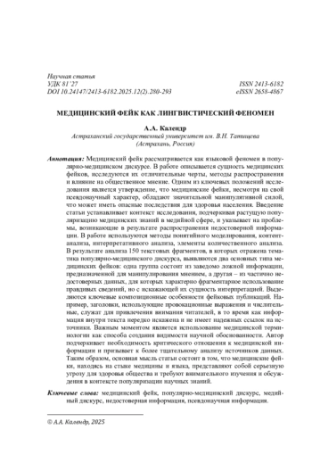 Медицинский фейк рассматривается как языковой феномен в популярно-медицинском дискурсе. В работе описывается сущность медицинских фейков, исследуются их отличительные черты, методы распространения и влияние на общественное мнение. Одним из ключевых положений исследования является утверждение, что медицинские фейки, несмотря на свой псевдонаучный характер, обладают значительной манипулятивной силой, что может иметь опасные последствия для здоровья населения. Введение статьи устанавливает контекст исследования, подчеркивая растущую популяризацию медицинских знаний в медийной сфере, и указывает на проблемы, возникающие в результате распространения недостоверной информации.