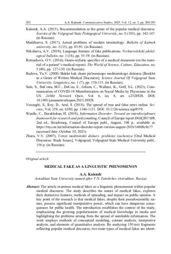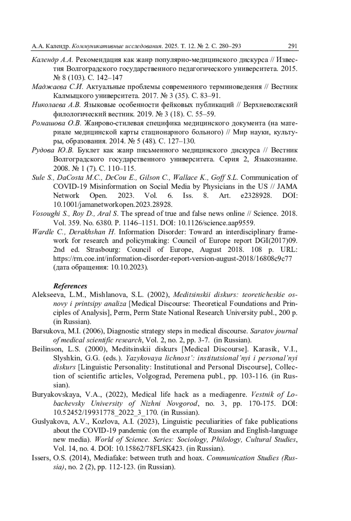 5. Гуслякова А.В., Козлова А.И. Языковые особенности фейковых публикаций о пандемии COVID-19 (на примере российских и англоязычных новых медиа) // Мир науки. Социология, филология, культурология. 2023. Т. 14. № 4. DOI: 10.15862/78FLSK423 EDN: KOAJOF