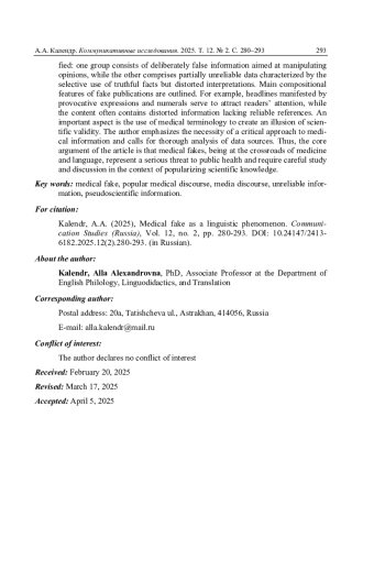 В работе используются методы понятийного моделирования, контент-анализа, интерпретативного анализа, элементы количественного анализа. В результате анализа 150 текстовых фрагментов, в которых отражена тематика популярно-медицинского дискурса, выявляются два основных типа медицинских фейков: одна группа состоит из заведомо ложной информации, предназначенной для манипулирования мнением, а другая - из частично недостоверных данных, для которых характерно фрагментарное использование правдивых сведений, но с искажающей их сущность интерпретацией. Выделяются ключевые композиционные особенности фейковых публикаций. Например, заголовки, использующие провокационные выражения и числительные, служат для привлечения внимания читателей, в то время как информация внутри текста нередко искажена и не имеет надежных ссылок на источники. Важным моментом является использование медицинской терминологии как способа создания видимости научной обоснованности. Автор подчеркивает необходимость критического отношения к медицинской информации и призывает к более тщательному анализу источников данных. Таким образом, основная мысль статьи состоит в том, что медицинские фейки, находясь на стыке медицины и языка, представляют собой серьезную угрозу для здоровья общества и требуют внимательного изучения и обсуждения в контексте популяризации научных знаний