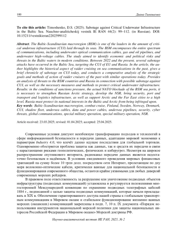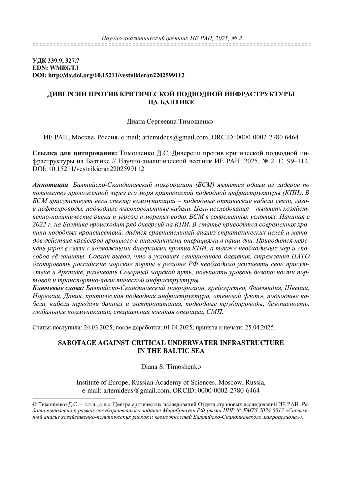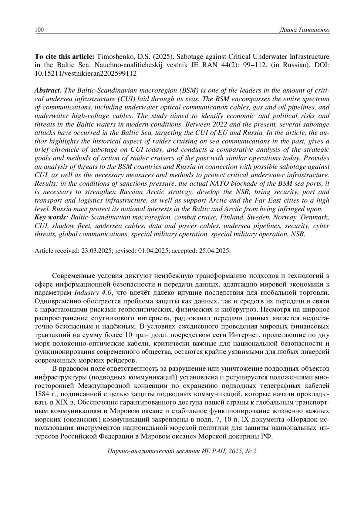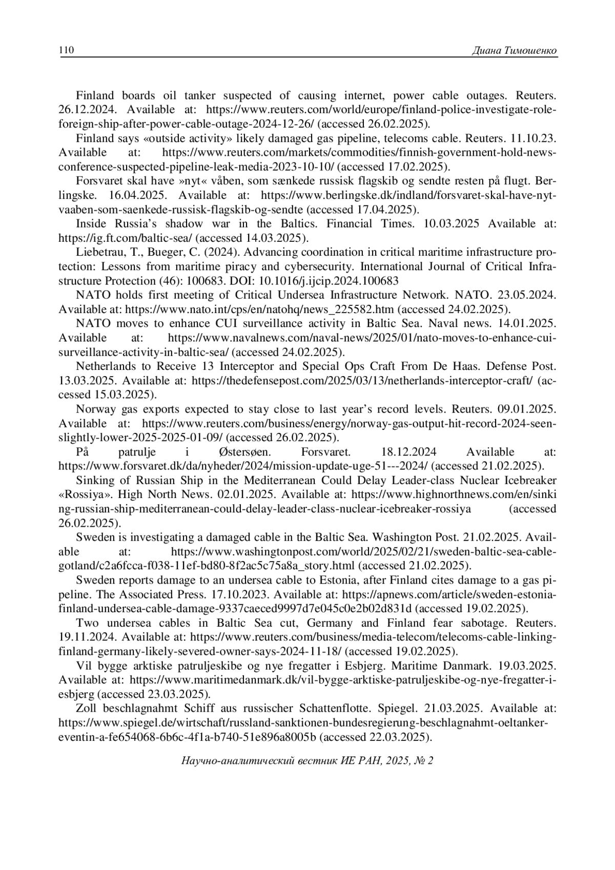 40. Хронология случаев повреждения подводных коммуникаций в Балтийском море. ТАСС. 27.01.2025. [Chronology of damage to underwater communications in the Baltic Sea. TASS. 27.01.2025. (In Russian)]. Available at: https://tass.ru/info/22983259 (accessed 17.02.2025).