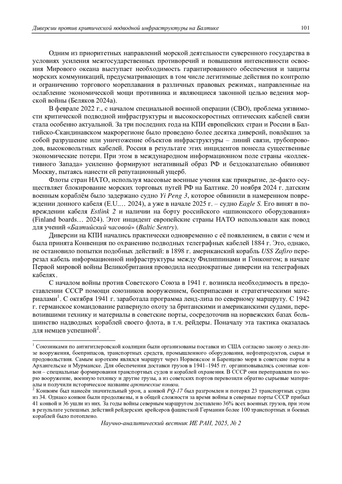 алтийско-Скандинавский макрорегион (БСМ) является одним из лидеров по количеству проложенной через его моря критической подводной инфраструктуры (КПИ). В БСМ присутствует весь спектр коммуникаций – подводные оптические кабели связи, газои нефтепроводы, подводные высоковольтные кабели. Цель исследования – выявить хозяйственно-политические риски и угрозы в морских водах БСМ в современных условиях. Начиная с 2022 г. на Балтике происходит ряд диверсий на КПИ. В статье приводится современная хроника подобных происшествий, даётся сравнительный анализ стратегических целей и методов действия крейсеров прошлого с аналогичными операциями в наши дни. Приводится перечень угроз в связи с возможными диверсиями против КПИ, а также необходимых мер и способов её защиты. Сделан вывод, что в условиях санкционного давления, стремления НАТО блокировать российские морские порты в регионе РФ необходимо усиливать своё присутствие в Арктике, развивать Северный морской путь, повышать уровень безопасности портовой и транспортно-логистической инфраструктуры