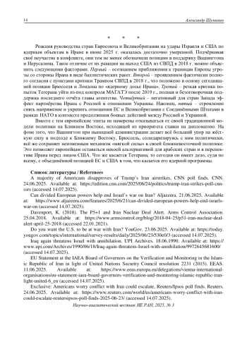 2. Can divided European powers help end Israel’s war on Iran? Aljazeera. 21.06.2025. Available at: https://www.aljazeera.com/features/2025/6/21/can-divided-european-powers-help-end-israels-war-on (accessed 14.07.2025).