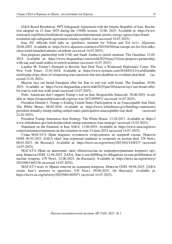 18. МАГАТЭ: Иран не выполняет свои обязательства по нераспространению ядерного оружия. Новости ООН. 12.06.2025. [IAEA: Iran is not fulfilling its obligations on non-proliferation of nuclear weapons. UN News. 12.06.2025. (In Russian)]. Available at: https://news.un.org/ru/story/2025/06/1465236 (accessed 14.07.2025).