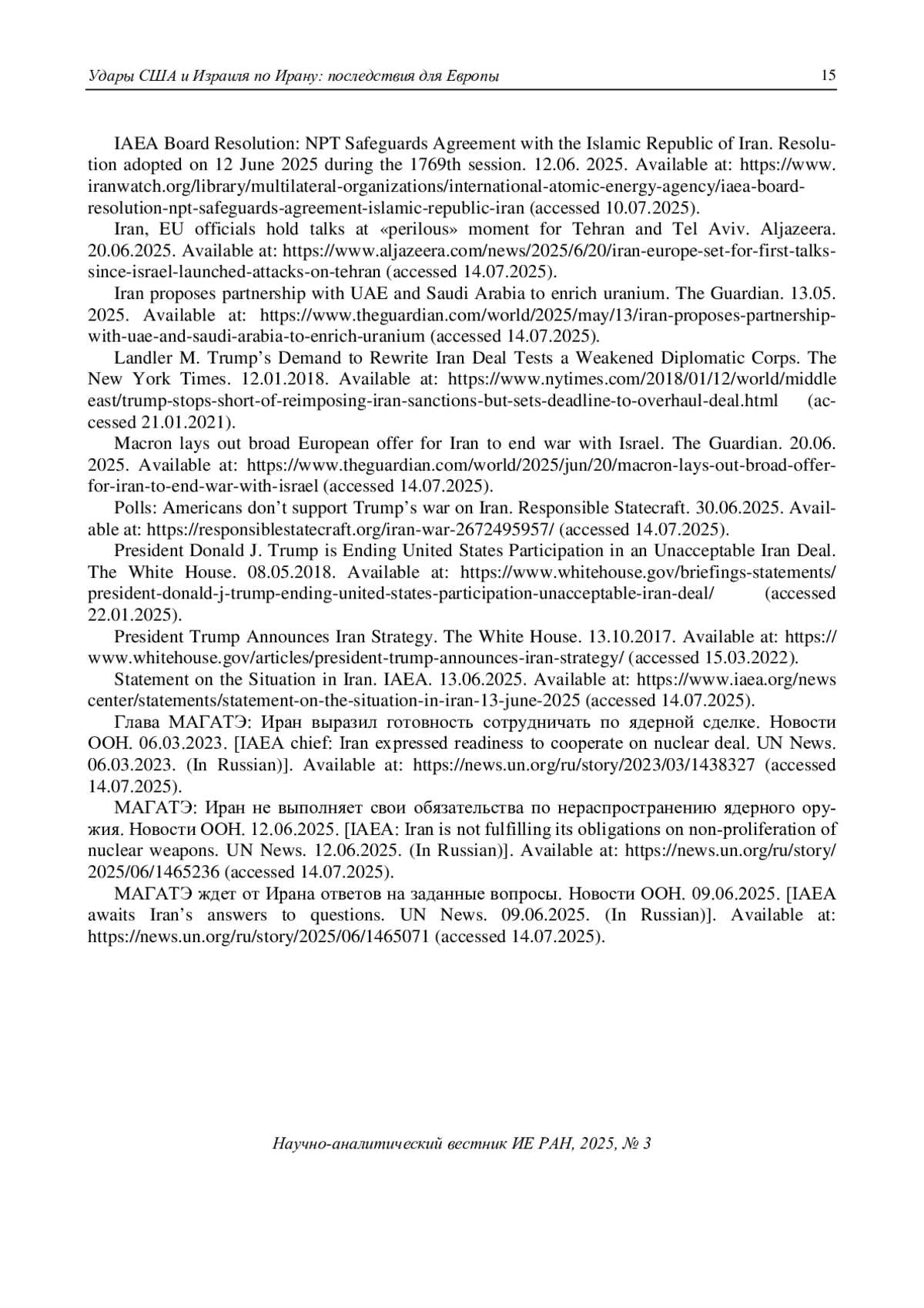 12. Macron lays out broad European offer for Iran to end war with Israel. The Guardian. 20.06. 2025. Available at: https://www.theguardian.com/world/2025/jun/20/macron-lays-out-broad-offer-for-iran-to-end-war-with-israel (accessed 14.07.2025).