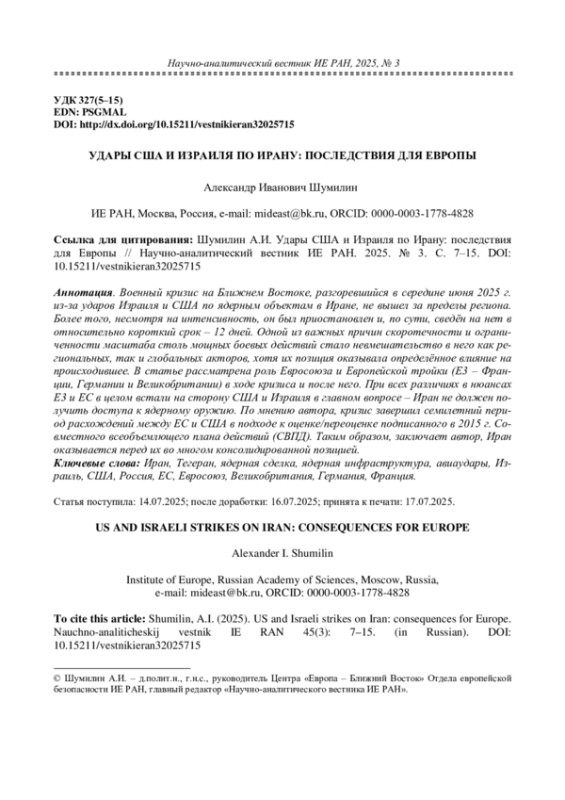 Военный кризис на Ближнем Востоке, разгоревшийся в середине июня 2025 г. из-за ударов Израиля и США по ядерным объектам в Иране, не вышел за пределы региона. Более того, несмотря на интенсивность, он был приостановлен и, по сути, сведён на нет в относительно короткий срок – 12 дней. Одной из важных причин скоротечности и ограниченности масштаба столь мощных боевых действий стало невмешательство в него как региональных, так и глобальных акторов, хотя их позиция оказывала определённое влияние на происходившее. В статье рассматрена роль Евросоюза и Европейской тройки (Е3 – Франции, Германии и Великобритании) в ходе кризиса и после него. При всех различиях в нюансах Е3 и ЕС в целом встали на сторону США и Израиля в главном вопросе – Иран не должен получить доступа к ядерному оружию. По мнению автора, кризис завершил семилетний период расхождений между ЕС и США в подходе к оценке/переоценке подписанного в 2015 г. Совместного всеобъемлющего плана действий (СВПД). Таким образом, заключает автор, Иран оказывается перед их во многом консолидированной позицией