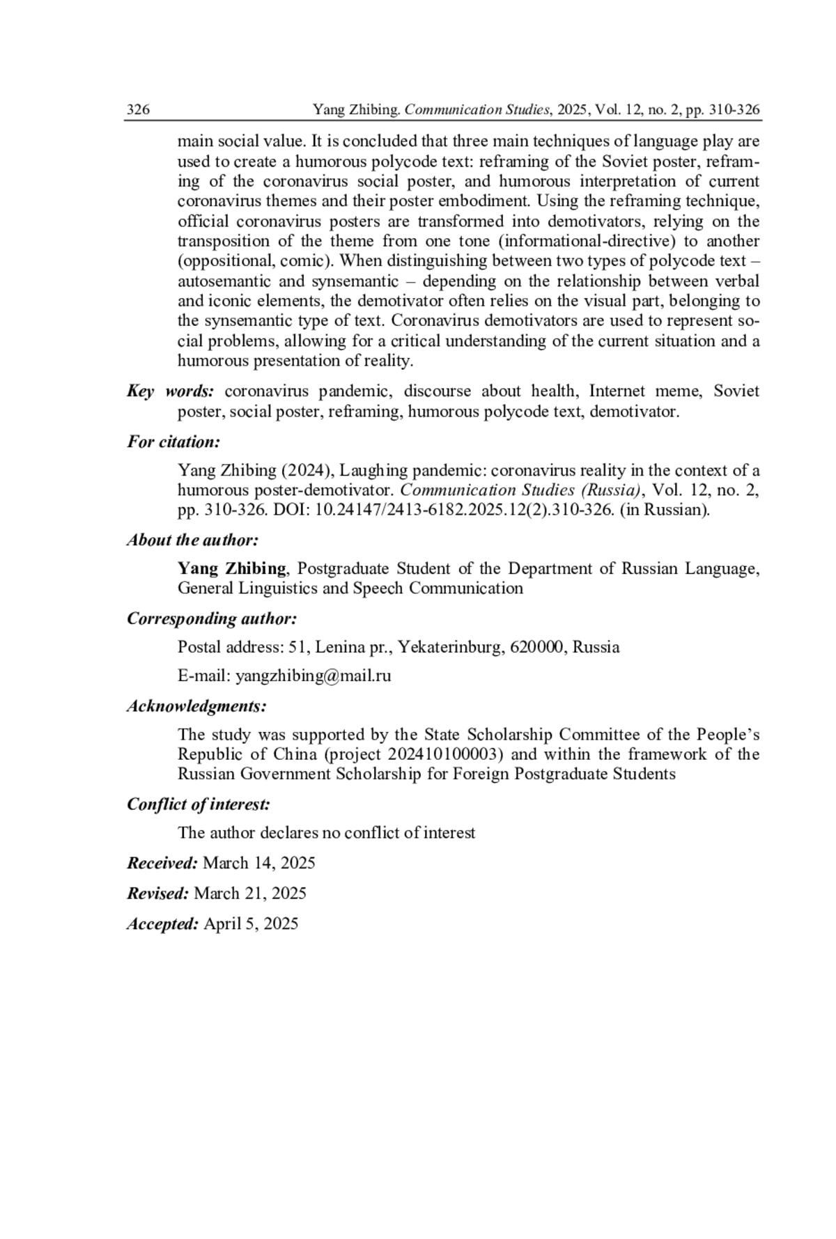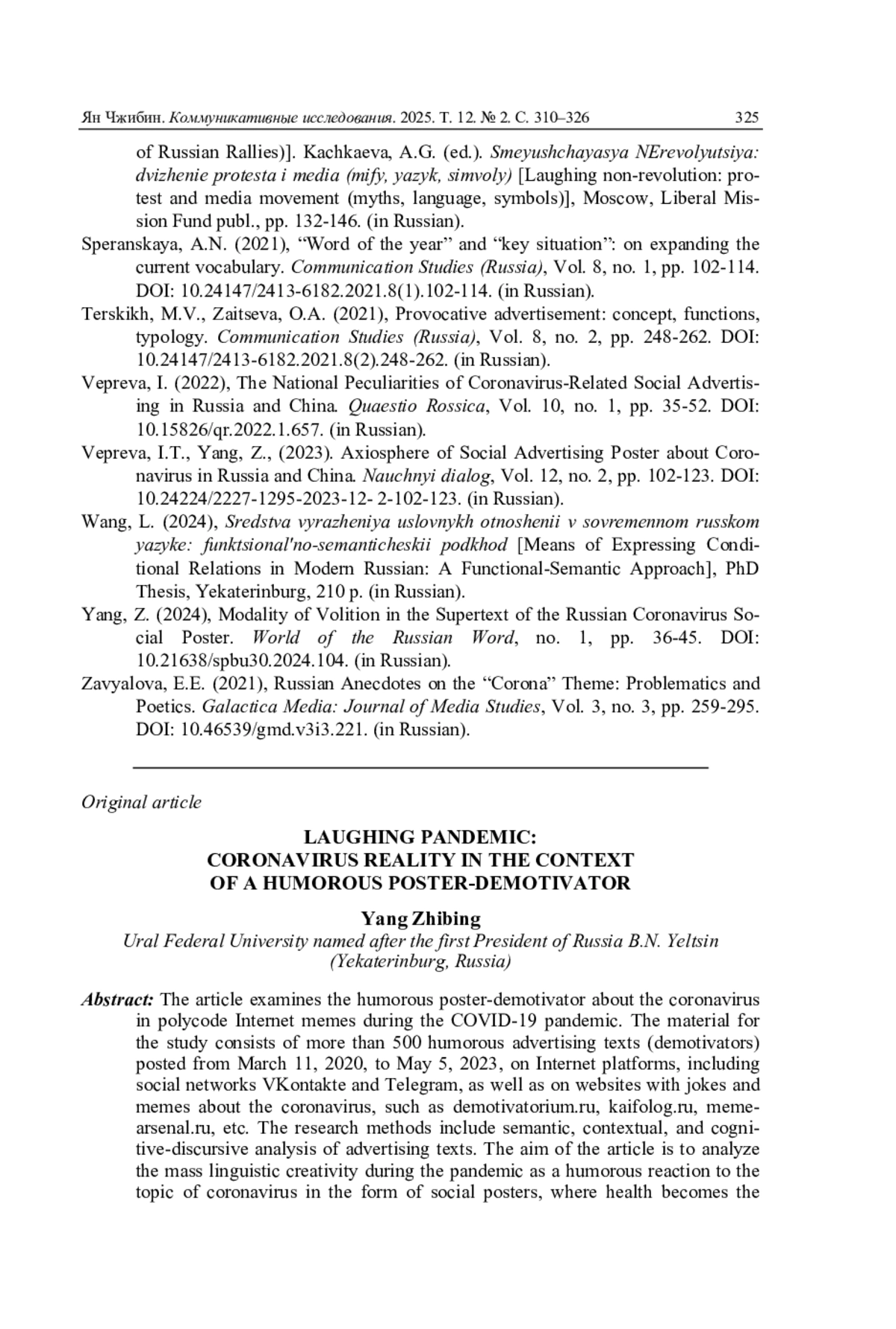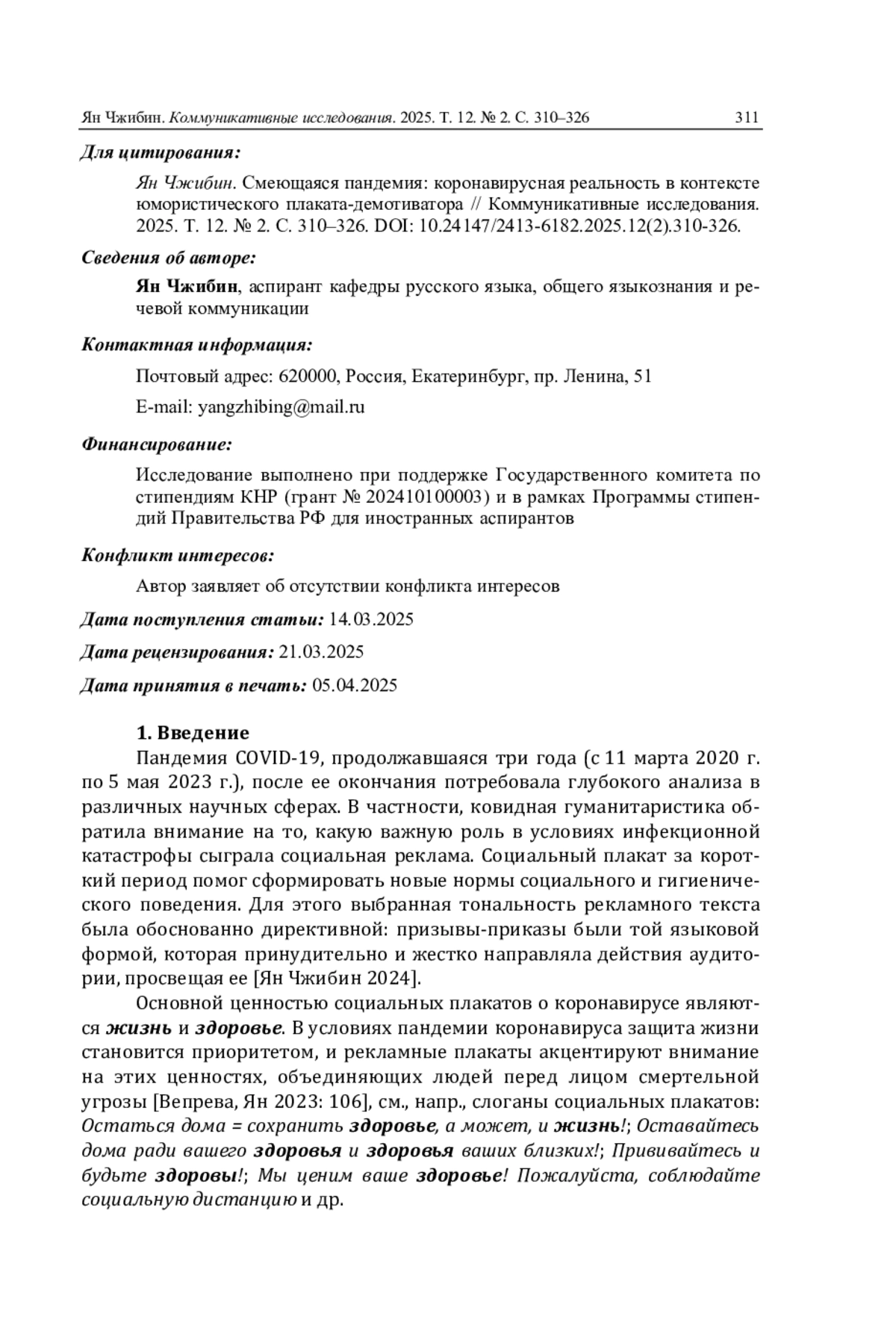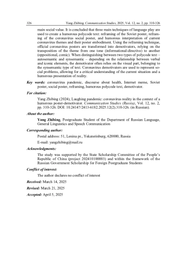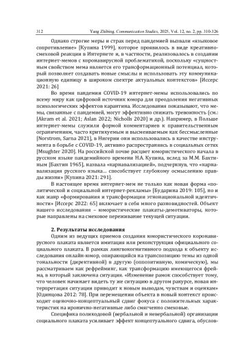 18. Ян Чжибин. Модальность волеизъявления в сверхтексте русского коронавирусного социального плаката // Мир русского слова. 2024. № 1. С. 36-45. DOI: 10.21638/spbu30.2024.104 EDN: IUTYBF