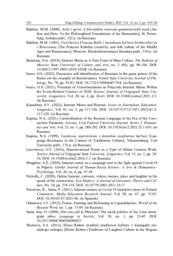 8. Иссерс О.С. Дискурсивная самоидентификация россиян в игровых жанрах Рунета (на материале демотиваторов) // Вестник Томского государственного университета. Филология. 2022. № 79. С. 59-83. DOI: 10.17223/19986645/79/4