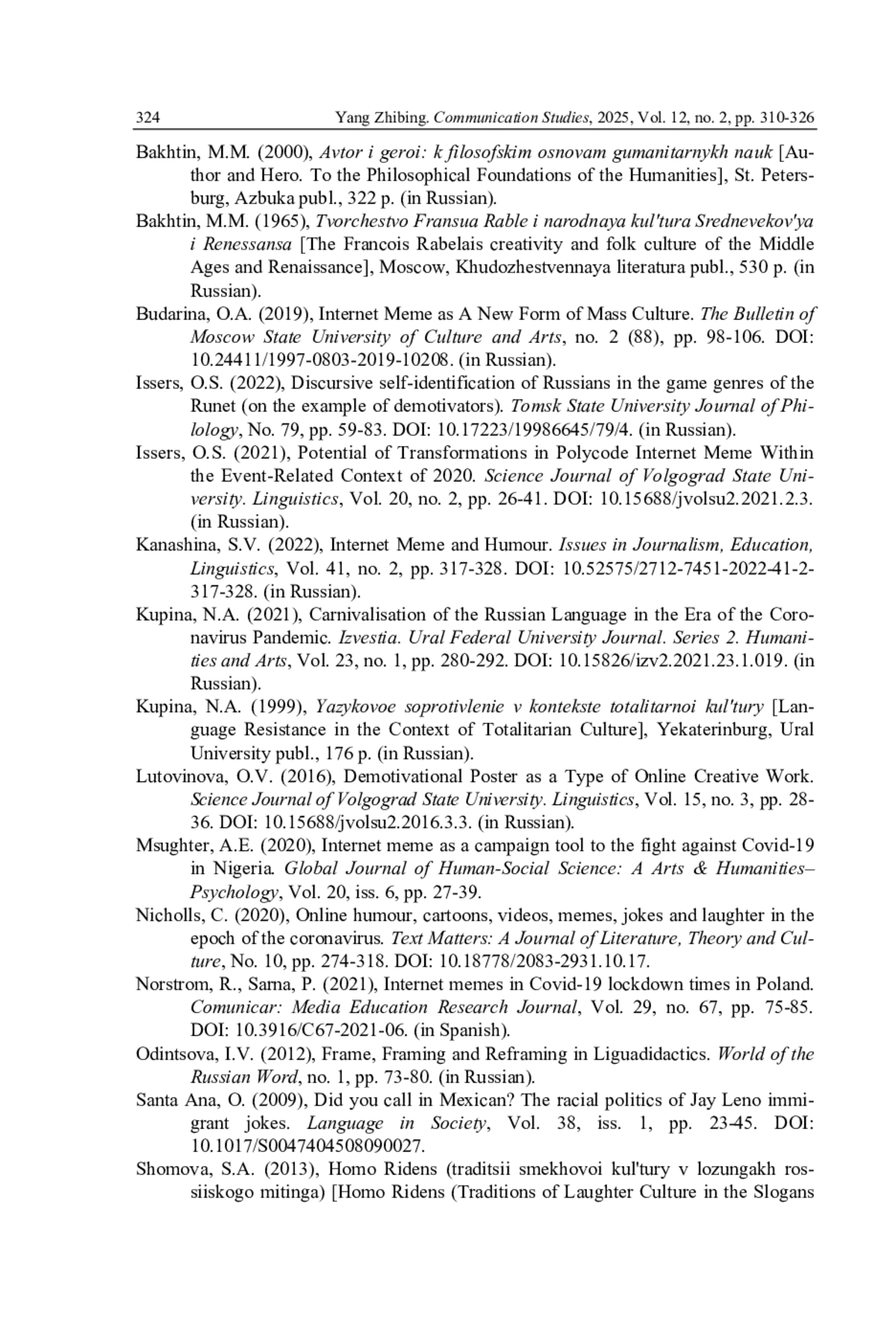 10. Канашина С.В. Интернет-мем и юмор // Вопросы журналистики, педагогики, языкознания. 2022. Т. 41. № 2. С. 317-328. DOI: 10.52575/2712-7451-2022-41-2-317-328 EDN: DBSPNS