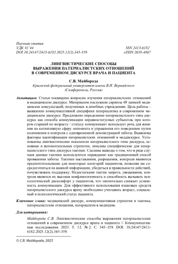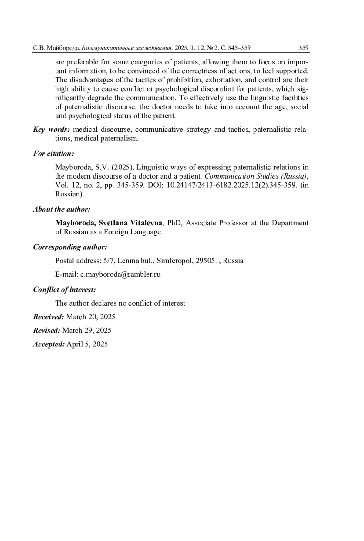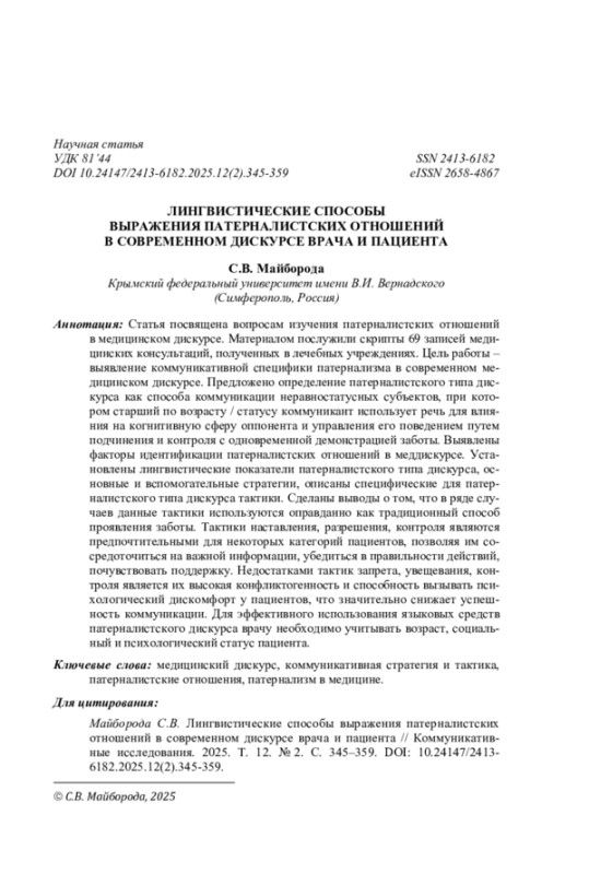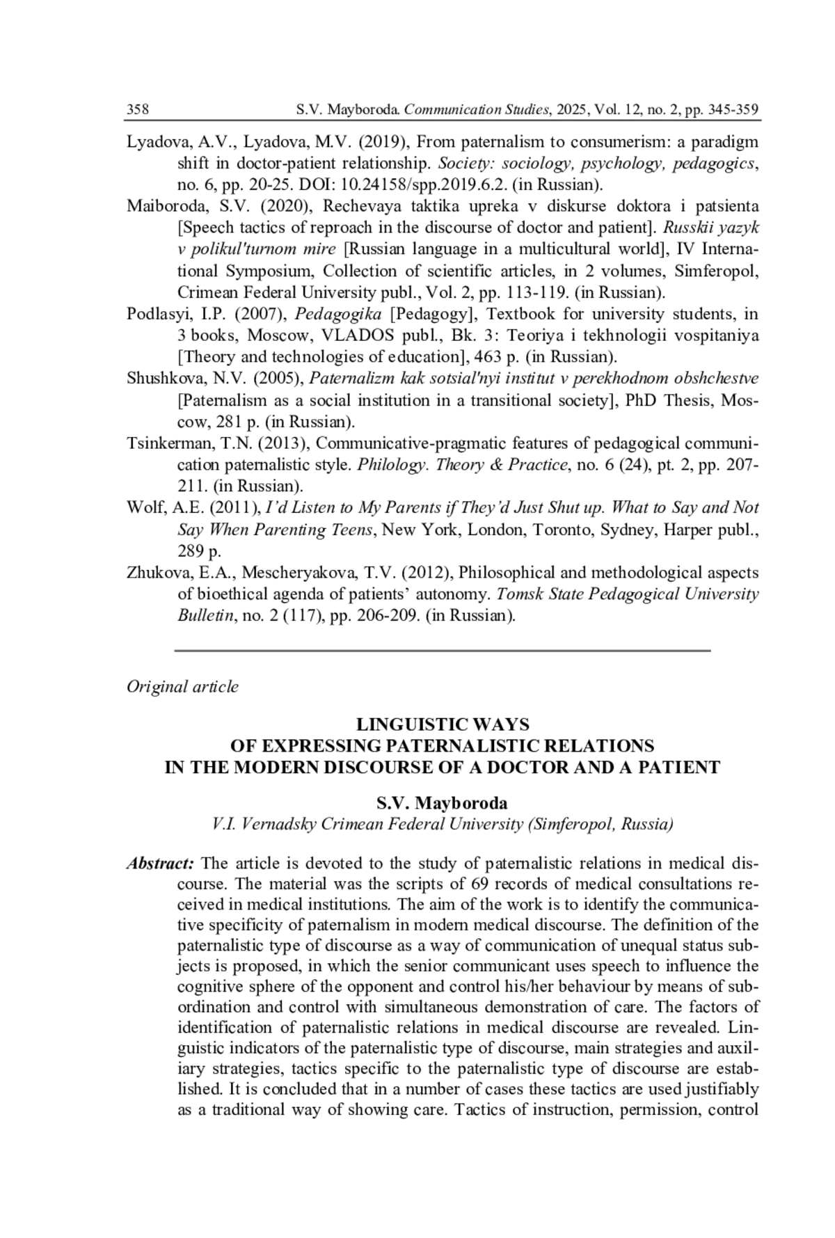 11. Майборода С.В. Речевая тактика упрека в дискурсе доктора и пациента // Русский язык в поликультурном мире: IV Междунар. симп.: сб. науч. ст.: в 2 т. Симферополь: Изд. дом КФУ, 2020. Т. 2. С. 113-119.