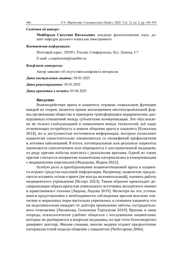 Взаимодействие врача и пациента, отражая социальную функцию каждой из сторон, является ярким воплощением институциональной формы организации общества и примером трансформации иерархических дискурсивных отношений между субъектами коммуникации. Это обусловлено не только глобализацией и появлением новых технологий, всё чаще отменяющих потребность в живом общении врача и пациента [Комалова 2024], но и доступностью источников информации, которые позволяют пациентам самостоятельно ознакомиться со спецификой профилактики и лечения заболеваний. В итоге, потенциальные или реальные пациенты занимаются самолечением или обращаются к альтернативной медицине, по ряду причин избегая контакта с реальными врачами. Одной из таких причин считается неприятие пациентами патернализма в коммуникации с медицинским персоналом [Федорова, Жаров 2022].
