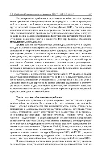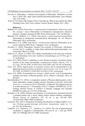 7. Комалова Л.Р. Структура и динамика коммуникативного взаимодействия в паре “потенциальный пациент - врач” в рамках письменной консультации на интернет-форуме // Russian Journal of Linguistics. 2024. Т. 28. № 2. С. 338-364. DOI: 10.22363/2687-0088-35049 EDN: EQVIJU