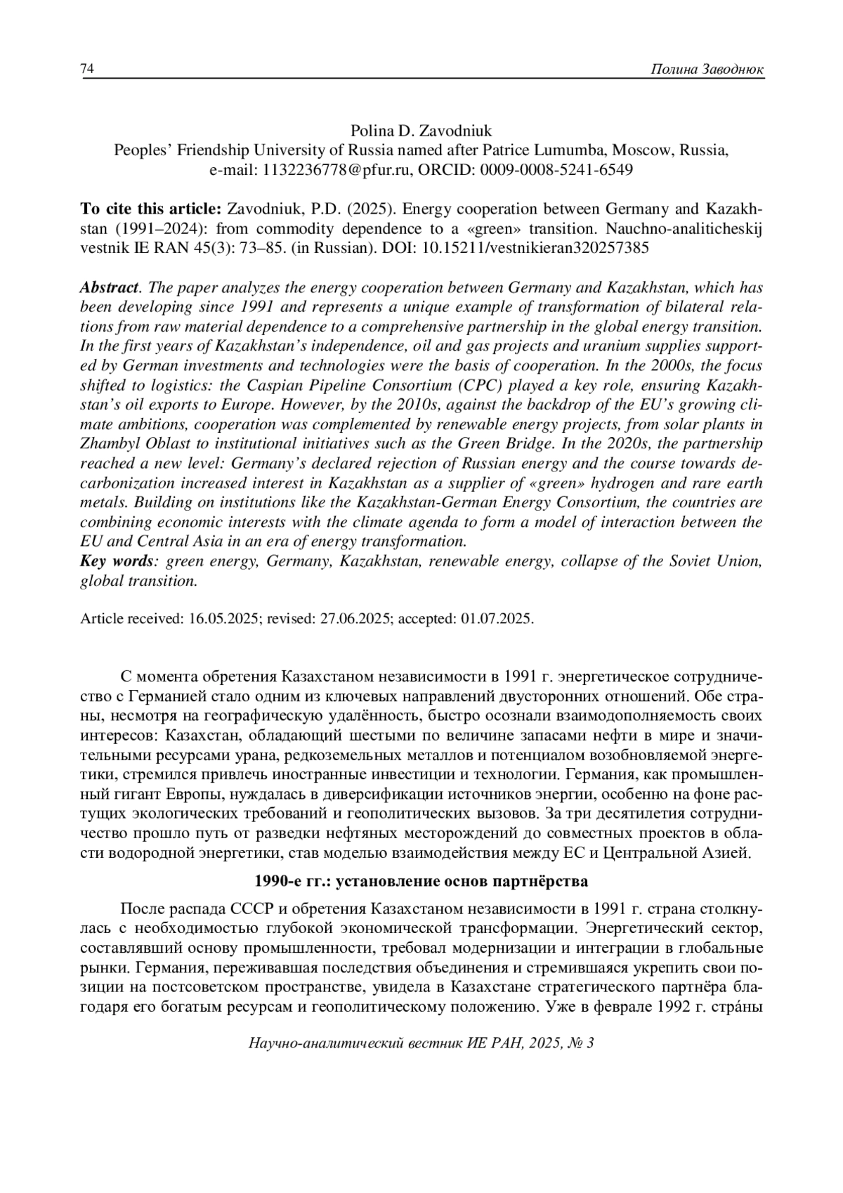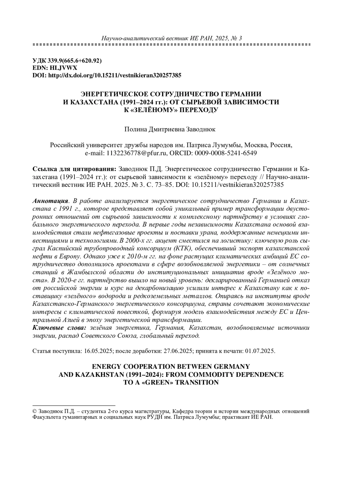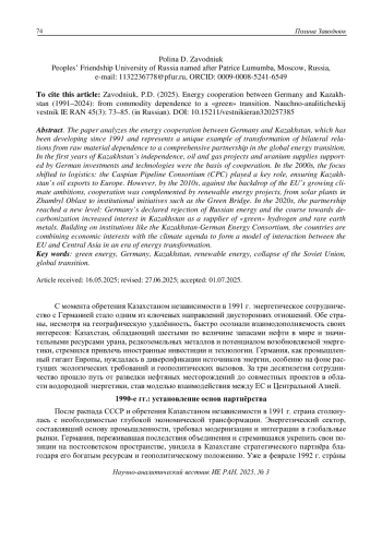 В работе анализируется энергетическое сотрудничество Германии и Казахстана с 1991 г., которое представляет собой уникальный пример трансформации двусторонних отношений от сырьевой зависимости к комплексному партнёрству в условиях глобального энергетического перехода. В первые годы независимости Казахстана основой взаимодействия стали нефтегазовые проекты и поставки урана, поддержанные немецкими инвестициями и технологиями. В 2000-х гг. акцент сместился на логистику: ключевую роль сыграл Каспийский трубопроводный консорциум (КТК), обеспечивший экспорт казахстанской нефти в Европу. Однако уже к 2010-м гг. на фоне растущих климатических амбиций ЕС сотрудничество дополнилось проектами в сфере возобновляемой энергетики – от солнечных станций в Жамбылской области до институциональных инициатив вроде «Зелёного моста». В 2020-е гг. партнёрство вышло на новый уровень: декларированный Германией отказ от российской энергии и курс на декарбонизацию усилили интерес к Казахстану как к поставщику «зелёного» водорода и редкоземельных металлов. Опираясь на институты вроде Казахстанско-Германского энергетического консорциума, страны сочетают экономические интересы с климатической повесткой, формируя модель взаимодействия между ЕС и Центральной Азией в эпоху энергетической трансформации
