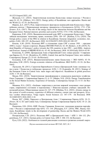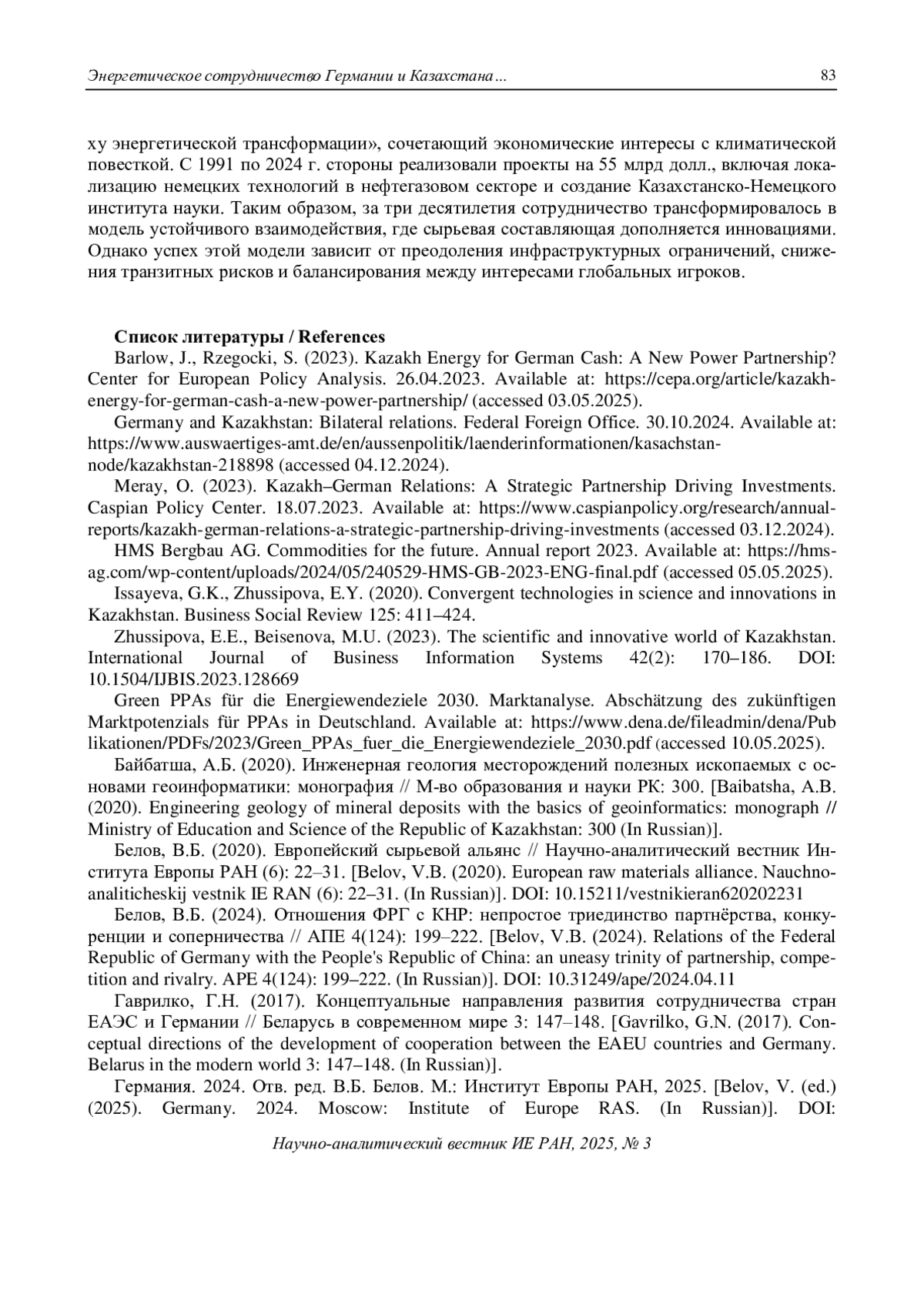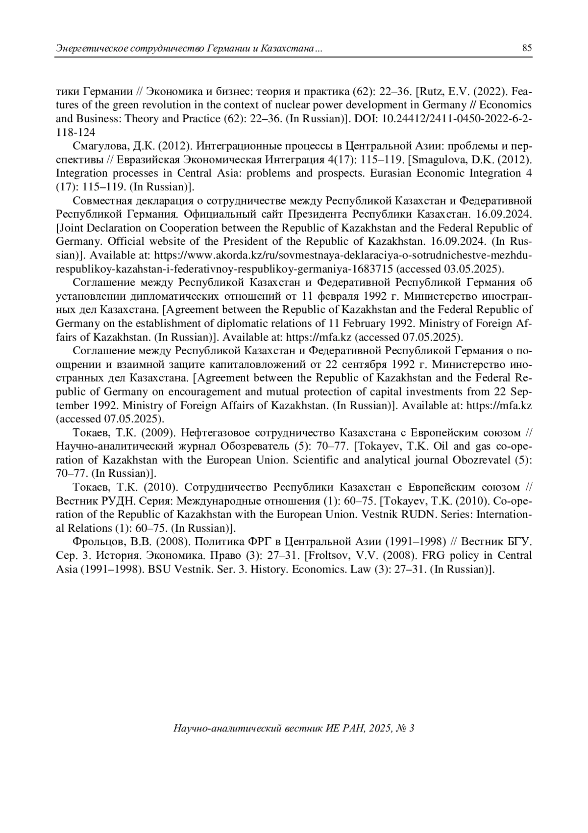 1. Barlow, J., Rzegocki, S. (2023). Kazakh Energy for German Cash: A New Power Partnership? Center for European Policy Analysis. 26.04.2023. Available at: https://cepa.org/article/kazakh-energy-for-german-cash-a-new-power-partnership/(accessed 03.05.2025).