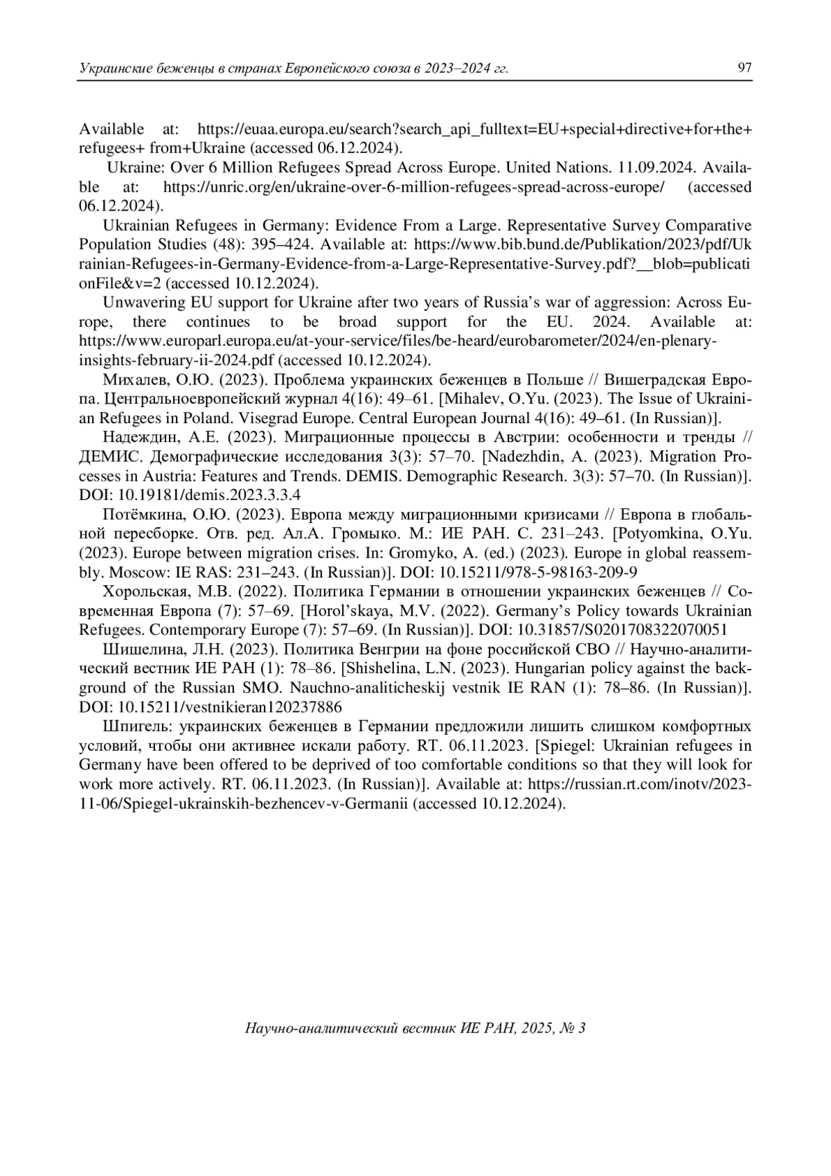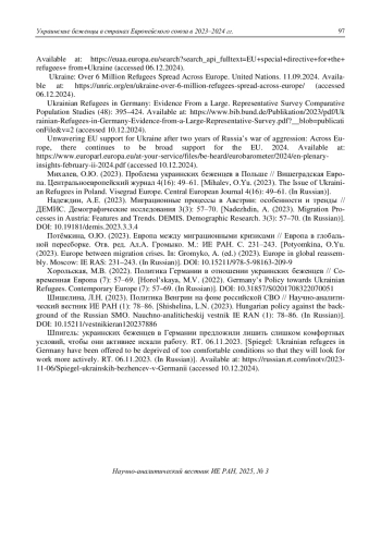 29. Потёмкина, О.Ю. (2023). Европа между миграционными кризисами // Европа в глобальной пересборке. Отв. ред. Ал.А. Громыко. М.: ИЕ РАН. С. 231-243. [Potyomkina, O.Yu. (2023). Europe between migration crises. In: Gromyko, A. (ed.) (2023). Europe in global reassembly. Moscow: IE RAS: 231-243. (In Russian)]. DOI: 10.15211/978-5-98163-209-9