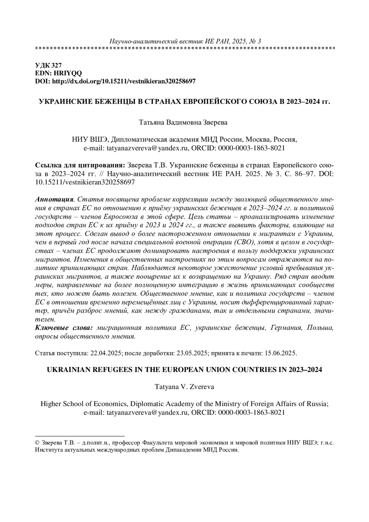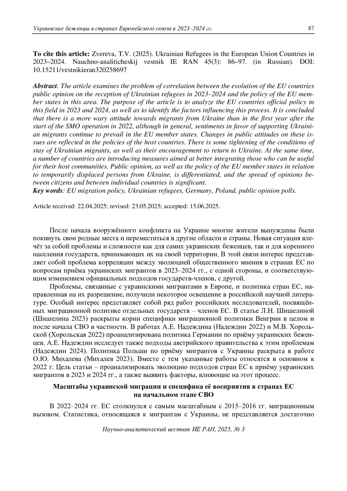 Статья посвящена проблеме корреляции между эволюцией общественного мнения в странах ЕС по отношению к приёму украинских беженцев в 2023–2024 гг. и политикой государств – членов Евросоюза в этой сфере. Цель статьи – проанализировать изменение подходов стран ЕС к их приёму в 2023 и 2024 гг., а также выявить факторы, влияющие на этот процесс. Сделан вывод о более настороженном отношении к мигрантам с Украины, чем в первый год после начала специальной военной операции (СВО), хотя в целом в государствах – членах ЕС продолжают доминировать настроения в пользу поддержки украинских мигрантов. Изменения в общественных настроениях по этим вопросам отражаются на политике принимающих стран. Наблюдается некоторое ужесточение условий пребывания украинских мигрантов, а также поощрение их к возвращению на Украину. Ряд стран вводит меры, направленные на более полноценную интеграцию в жизнь принимающих сообществ тех, кто может быть полезен. Общественное мнение, как и политика государств – членов ЕС в отношении временно перемещённых лиц с Украины, носит дифференцированный характер, причём разброс мнений, как между гражданами, так и отдельными странами, значителен