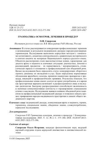 В статье рассматривается конкуренция профессиональных терминов и возникающих в актуальном медицинском дискурсе народно-разговорных терминоидов. Исследование выполнено корпусным методом с элементами когнитивного, семантико-синтаксического, сравнительно-исторического и контент-анализа на материале Национального корпуса русского языка. Объектом рассмотрения стали высокочастотные клише, характерные для диалога врача и пациента в ключевых ситуациях диагностики, лечения и рекомендаций, предметом - их нормативность / ненормативность, стилистическая окраска и отношение к профессиональной или обыденной речи. Целью исследования было определить статус конкурирующих оборотов и оценить динамику их вхождения в узус. Были определены нормативные обозначения врачебного осмотра, принятия пациентами препаратов и процедур, инъекций и профилактических прививок. Результаты показали, что профессиональные клише имеют долгую историю употребления, в то время как просторечные варианты возникают и распространяются лишь в последние десятилетия. Быстрому распространению способствуют включенность в значимые коммуникативные контексты и тиражирование социальными сетями и массмедиа. Исследование выявило влияние обыденной речи пациентов на профессиональный медицинский дискурс и позволило описать процесс превращения народно-медицинского просторечия в элемент общего медицинского жаргона